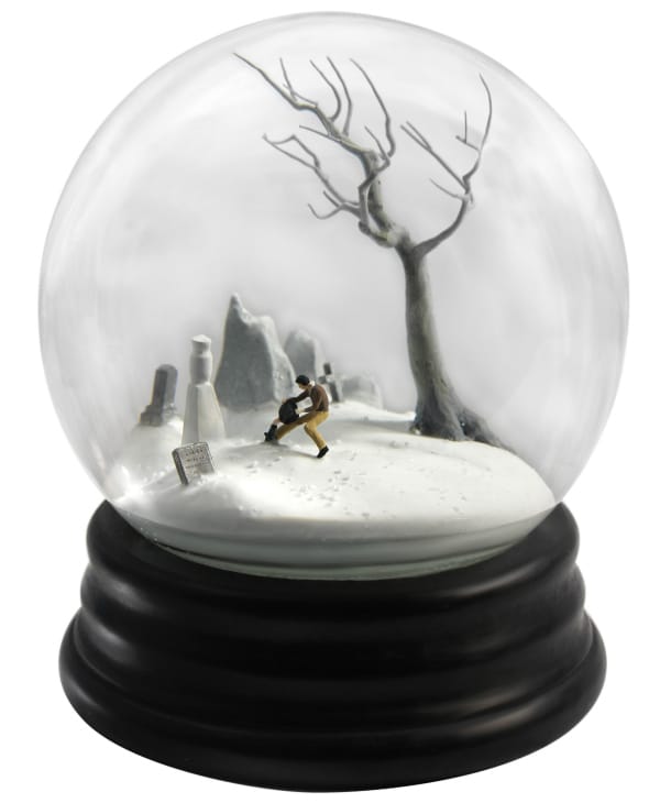 A wall of snowglobes by Walter Martin and Paloma Muñoz at first appears serene, until you lean in closer and see unsettling snowscapes where bodies are smuggled in rugs, a boy learns to shoot a gun, and a figure tries to wrench a brief case from a dead man’s hand.