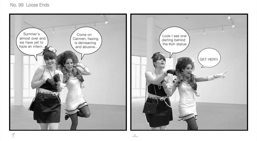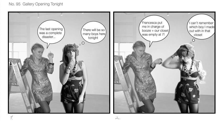 Digitally edited together from dress-up photo shoots with her friends, Blakemore’s comic is graphically punchy and satirical in its knowledge of gallery-work details. The gallerina commentary doesn’t come from firsthand experience in the job, though, nor from an art school background. “I love going to the galleries, and I’ve been a receptionist before, but not at a gallery. I know that role that you play in an office, and how you can kind of get beat up a little bit.”