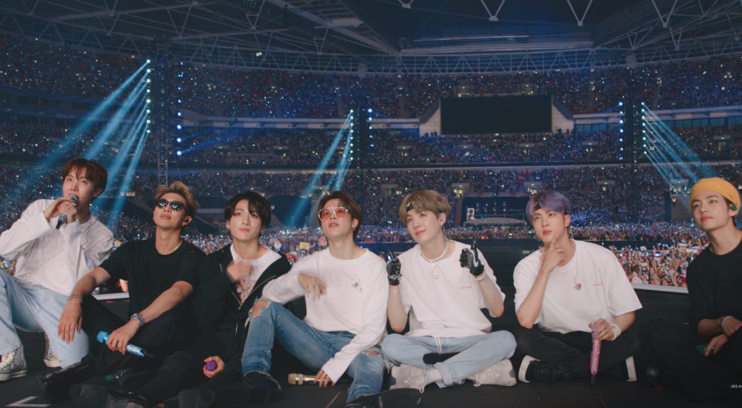 The film follows the band during their 2018-2019 Love Yourself: Speak Yourself world tour, tracking both their historic stadium shows and their post-performance astonishment. “I don’t see myself as someone worthy of having so much influence,” RM reflects over a scene of the band storming a stage. Concert footage occupies much of the runtime, blurring together in a sea of ARMY Bombs. When the members introduce themselves, they demarcate birth and stage names: Kim Namjoon (RM), Kim Seokjin (Jin), Min Yoongi (Suga), Jung Hoseok (J-Hope), Park Jimin (Jimin), Kim Taehyung (V), and Jeon Jungkook (Jungkook). At one dinner, they suggest they say a few more lines for the camera “before we get too drunk.” I’d forgotten they weren’t perpetually on camera.