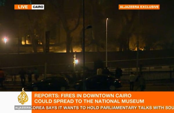 Al-Jazeera is reporting a troubling development at the Egyptian Museum in Cairo. The Qatar-based news network has been extensively covering the political protests that have engulfed Egypt, causing the country to cut off the internet to those within its borders. Al-Jazeera has been showing images of the fires which are burning around downtown Cairo and they mention that the flames could spread to the world-renowned Egyptian Museum.