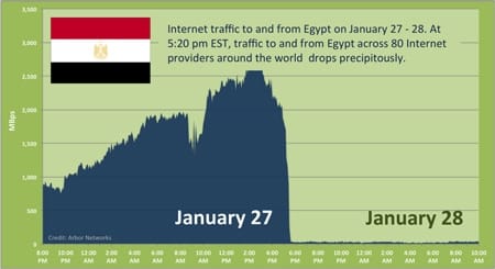 Internet in Egypt, as far as we can tell, has now been disabled for a full 24 hours. Arbor Networks, which has been monitoring traffic in and out of the country over 80 service providers, has released an updated graphic: