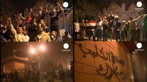 Here are some key screenshots, including a shot of the graffiti on the front gate, which reads “down with the dog Mubarak”: