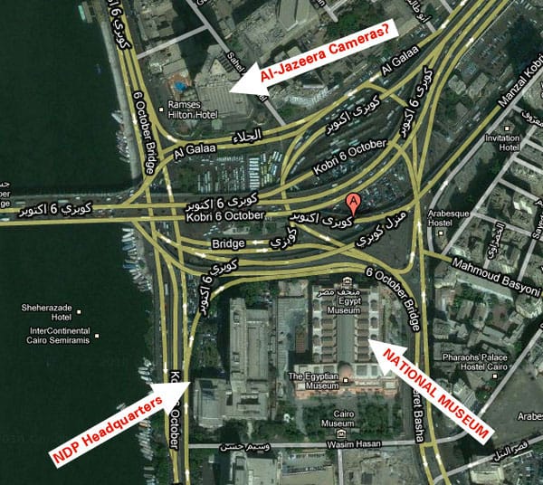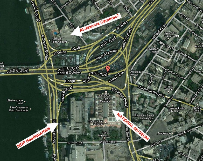 UPDATE 15: 6:01pm EST: We’ve been trying to figure out the location of the Al-Jazeera cameras to figure out how close the National Museum is to the NDP headquarters, which is on fire. We have not been able to find the exact address of the NDP headquarters.