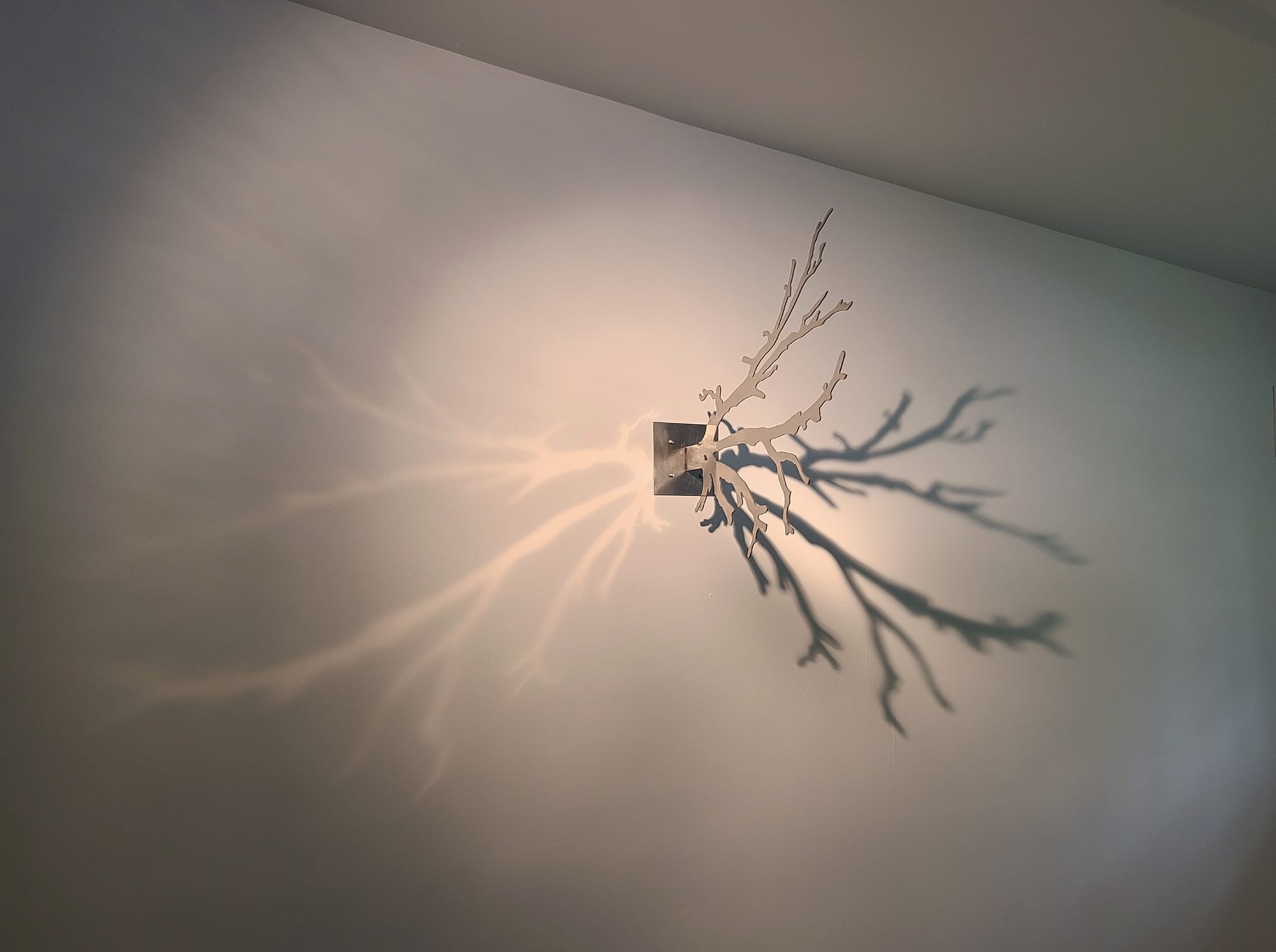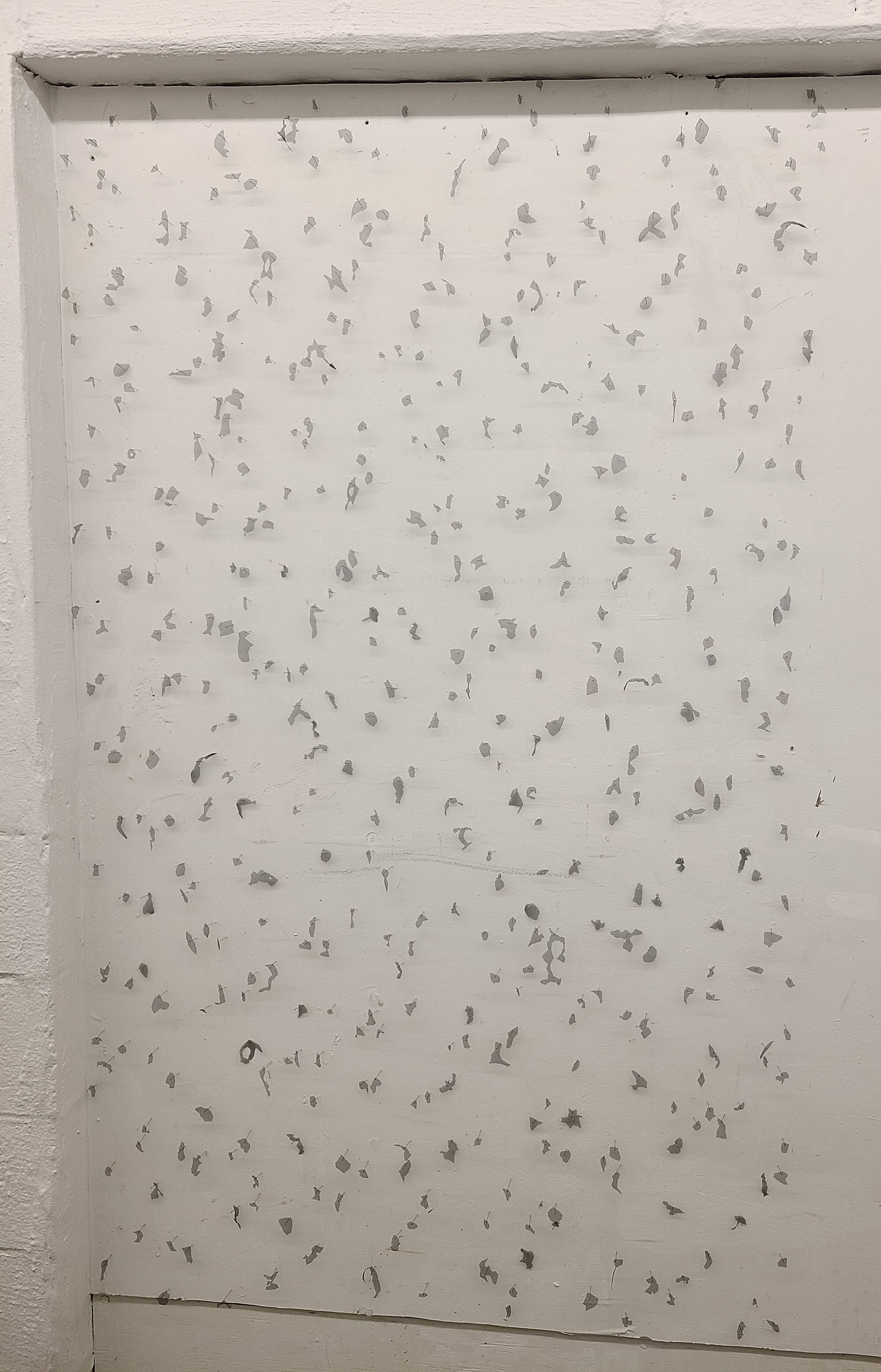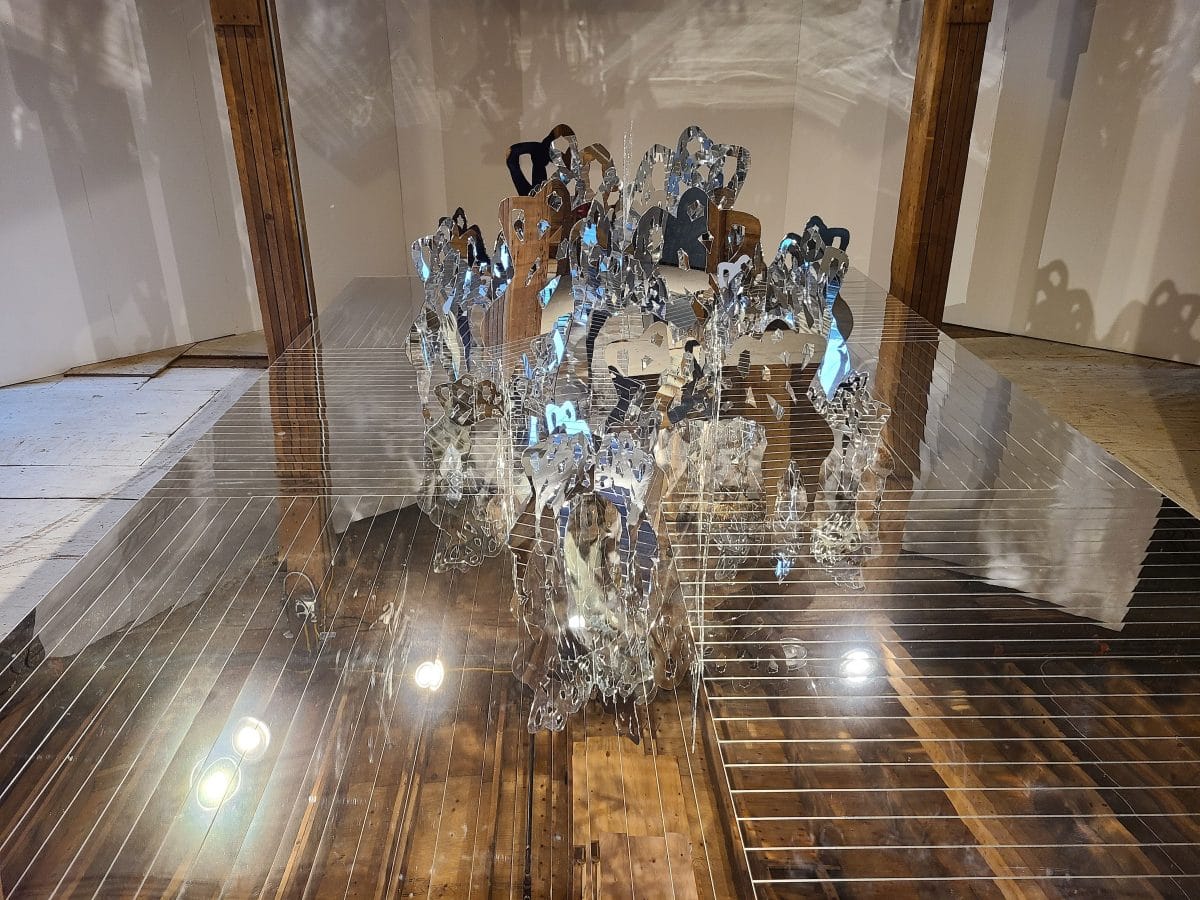 I first visited Mohonk Arts in High Falls, which has a residency program that currently includes four artists, but for the weekend they invited several more creators into their shed-like building. The work there was all kinds of gorgeous. I particularly liked Suzy Sureck’s “Branch” (2017), an installation of stainless steel antlers jutting out from the wall, and precise lighting to make the object feel both beautiful and menacing. I adored Megan Pahmier’s “fall-out 20/21” (2021), which, on one side of the hall, consisted of one thin scrim of fiberglass that had been riddled by some violent force, and against the other wall the excised pieces suspended in perfect formation.