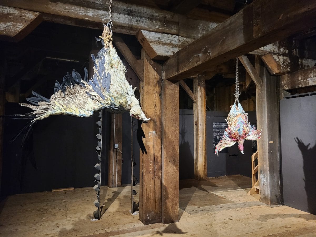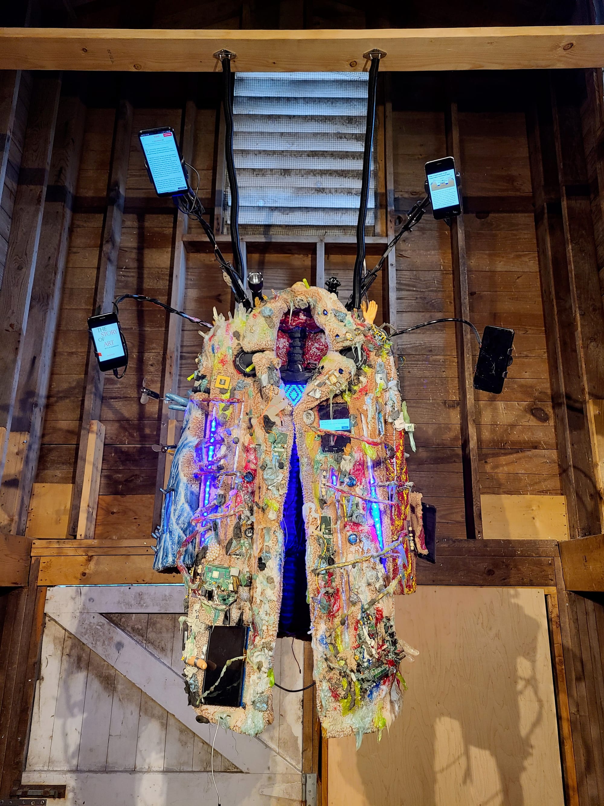 Next I visited Wassaic Project, and knew I had made the right choice because immediately on entering the space I ran into the work of an artist whose work I adore: Tamara Kastionovsky, who had her "Big Vulture" (2017) and "Every Color in the Rainbow" (2021) birds hung from rafters. She makes pieces that are concoctions of discarded clothing and upholstery fabric that looks like a version of Schrödinger's cat to me — both alive and dead at the same time. The artist Marianna Peragallo had several cute installations at each landing on the staircase leading up the barn structure that made the whole journey up feel like an easter egg hunt. And then upstairs, I ran into a dazzling installation by Shoshanna Weinberger, including "A Sense of Sight" (2021), a collection of mirror acrylic versions of her fantastically elaborated woman forms that are a consistent motif in her work.