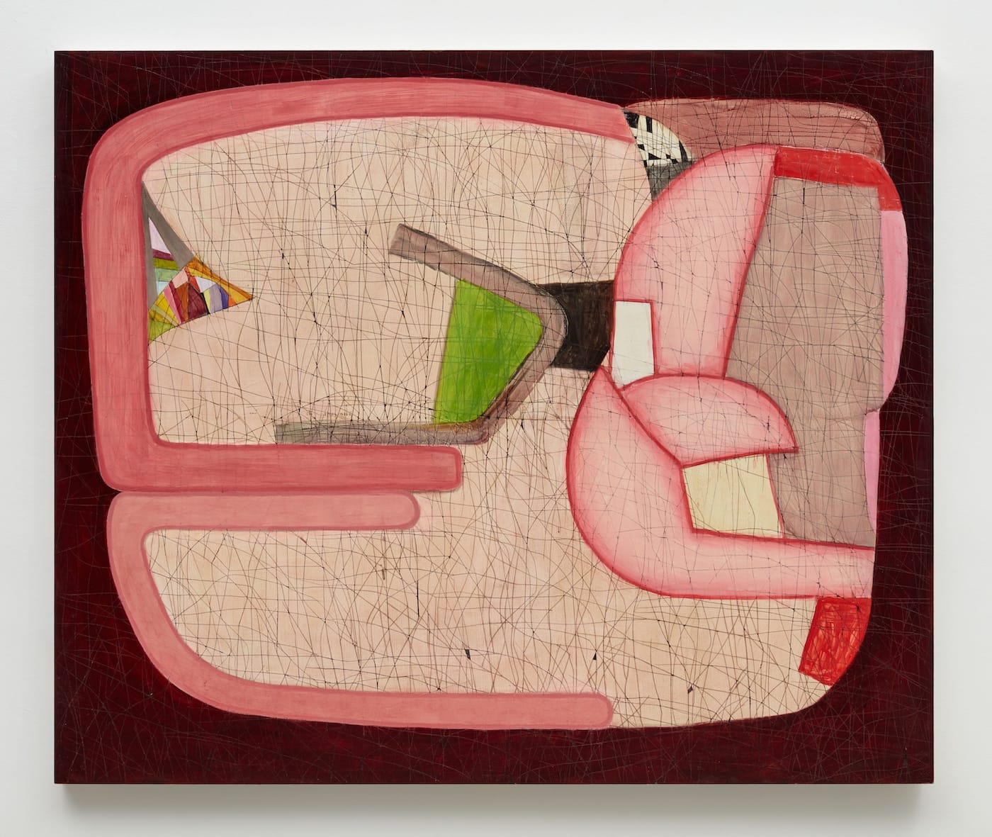 Compared with the work Goodman showed, mostly in Brooklyn, over the past few years, the current paintings are more abstract and less overtly figural. Rather than dominate the paintings with a single form, she disperses layered shapes across the surface, as in “Possibility of Age.”