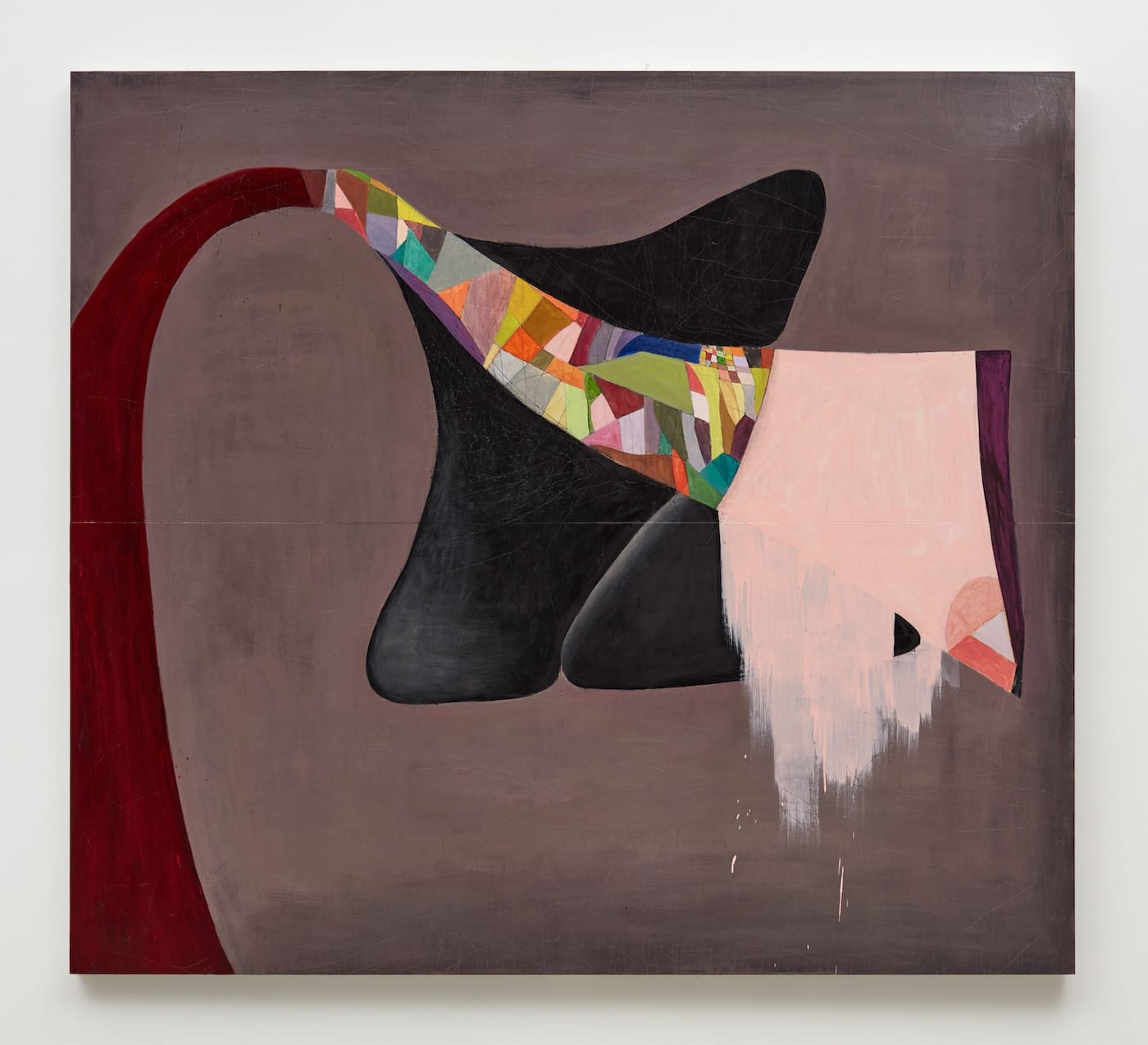 Look at all the different sections that make up the maroon, stalk-like form that rises along the left edge of “Dance” before veering off to the right — bending and widening, like a horn, across the width of the painting’s two stacked panels.