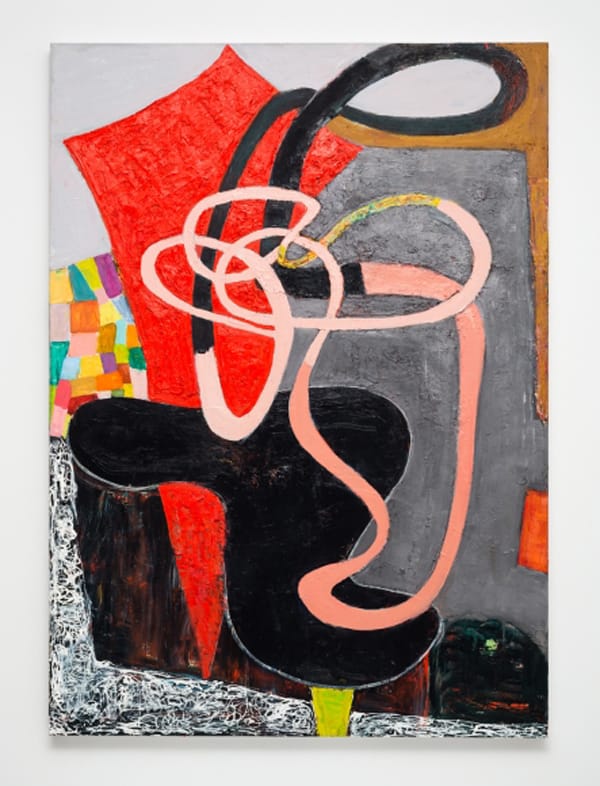 One of the interesting things about this form, which seems to be seated in the painting’s lower left corner, is that it is both abstract and figurative, with neither dominating the other. When I read it figuratively, I have to consider the other shapes in light of that view. Is the black, biomorphic form a body? What about the eye-like dot in the small black shape in the lower right corner? Or the red kite (or is it a blade?) that plunges downward from the top edge? Or the looping network that changes from pink to salmon to black? One of the beauties of Goodman’s painting is its refusal to settle for the immediately legible. By making work that can be read as either abstract or figurative, she invites viewers to become self-reflective and consider the dynamics of relationships. Goodman’s work gains further urgency at this time, where the concept of clarity is confused with whatever is quickly and comfortably identifiable.