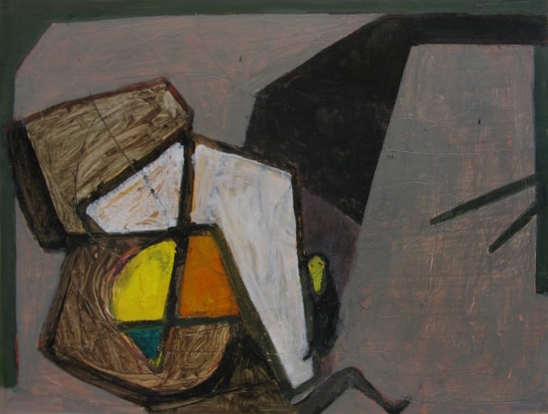This figural form – made of scraped and scribbled white paint on a dark ground — is topped by a slightly bulging rectangle made of a patchwork of different colors (orange, yellow, green, blue, red, pink, brown, and violet). To the right of this abstract figural form we see a red kite/blade, a black biomorphic shape, and a thick, looping line that goes from black to pink to salmon. These and other shapes are compressed into a layered, claustrophobic space.