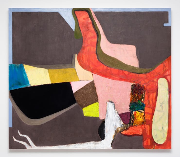 In the oil on paper, “Don’t Know Why But I Do” (2016), the dominant form hovers between a boldly outlined configuration you might see in a late 1930s Cubist still life by Lee Krasner and a hybrid geometric figure projecting a mammoth, black leg and talons to the far right edge of the sheet. Below this form, and extending out of it as if crushed beneath its weight, the silhouette of a tiny leg and foot rests along the bottom of the picture. The shift in scale opens the work up, as well as raises the question: what is the relationship between the two? And what about the black form with the elongated, bilious green head floating above the leg and foot?
