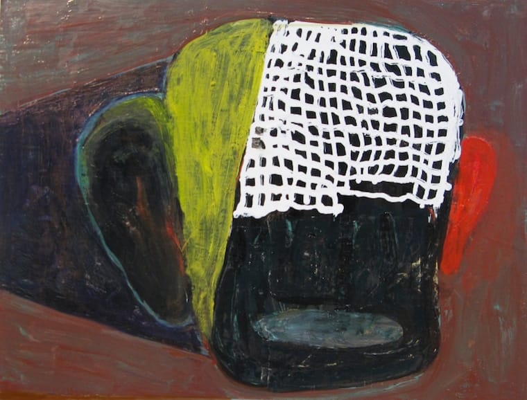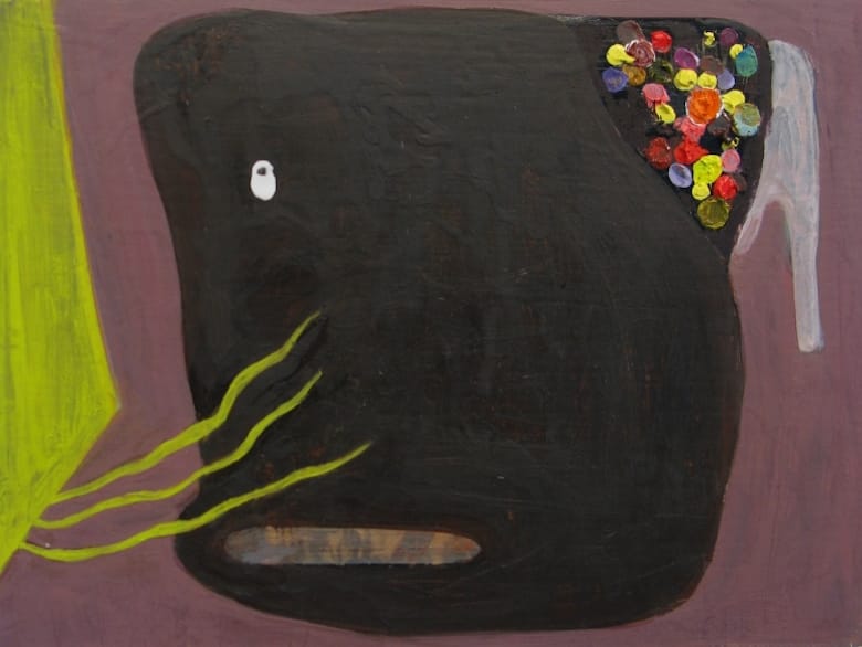 Also six by eight inches, “Sad Guy” (2016) is dominated by a large black misshapen square. With its eye closer to the upper left-hand corner as it looks from right to left, I was reminded of a whale. A black triangle filled with bright, raised circles of paint is affixed to the upper right side of the black square like a cap, which completes the shape’s quasi-square form. A pinkish-gray trunk hangs from the cap on the upper right, while a green, truncated triangle with three long whiskers or feelers extends into the picture from the left edge. What is the nature of this encounter? While viewers might empathize with this creature, Goodman never offers a reason why it might be sad.