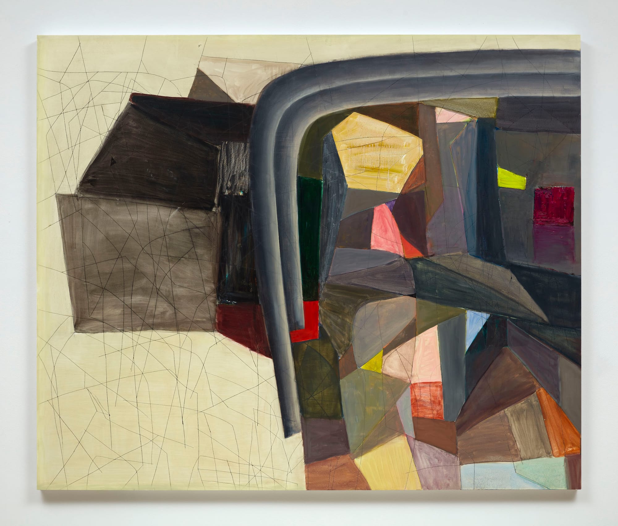 “Above and Beyond” (2022) is marked by deep incisions, a field of cuts, in its mostly dirty ivory surface. Two gray tubular forms extend in from the top right edge and turn downward near the middle, dividing the composition into almost equal parts. On the painting’s right side, Goodman depicts a receding space occupied by an open red doorway, which casts red light into the area below it. The space is located within a layered world of abstract silhouettes in different shades of black, gray, and taupe, interspersed with pale yellow, pink, and blue forms. On the painting’s left side is a large, irregular rectangle in a washy gray, topped by a black shape that seems to be tilting back in space. The tubular forms divide one world from another. From the juxtaposition of volumetric forms and flat rectangles to the cut surface and the smeary red doorway casting its fading color, all kinds of tensions abound in this work.