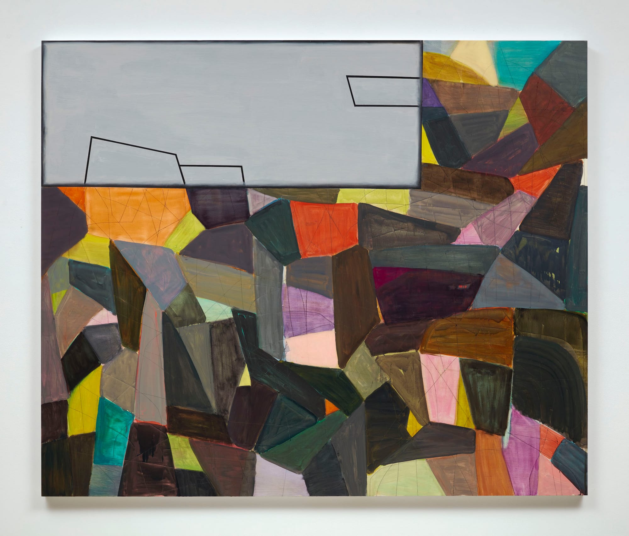 In “Let It Shine” small shards of soft yellow and pale blue peek through a wall of mostly dark green, brown, slate gray, and taupe geometric shapes. A large, slightly curving shape is outlined in black in the painting’s upper half. Within that clearly demarcated area are washes of soft, luminous yellows, pinks, reds, and tans, with a pale green shape in the middle. For all of the darker shapes’ flatness and adherence to the picture plane, the shards of pastel colors evoke a space behind the mosaic wall in which a few cuts are visible. Set within this wall, the outlined shape seems to be both billowing and held in place by the surrounding darker, geometric shapes. The floating form filled with cheerful colors is new to Goodman’s work. The paradoxical combination of freedom and entrapment animates the composition, and invites viewers to read into the painting, particularly in light of her previous preoccupations with the damaged body.