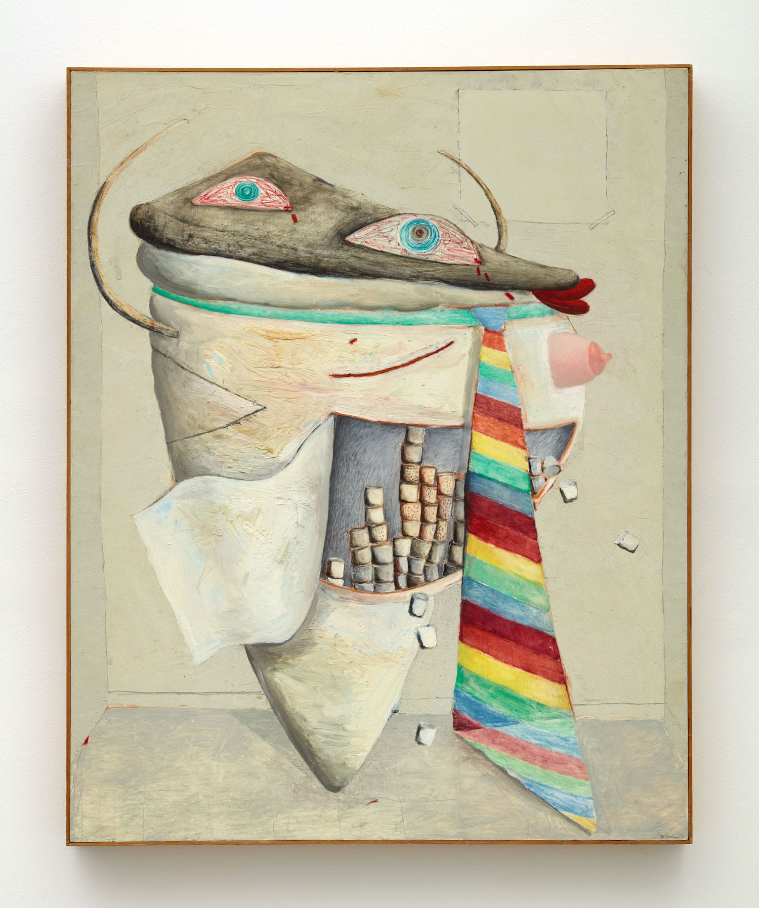“Self-Portrait 1” depicts, in a palette of mostly grays and dirty whites, a large, misshapen conical structure balanced on its point in a small room. On top of the cone is a triangular shape (think a dark gray pizza slice), which is topped by two bleeding, bloodshot eyes (think taco shaped) and a folded, dark red, tongue-like shape that sticks out from under the front end. Part of the front of the cone’s chest has been peeled back, exposing stacks of what look like marshmallows. We also see a single breast protruding from the cone and a huge, brightly striped necktie hanging down to the floor. Behind this creature a blank sheet of paper has been taped to the wall. This is a portrait of the artist with horns, baring her heart to reveal that she is full of marshmallows.