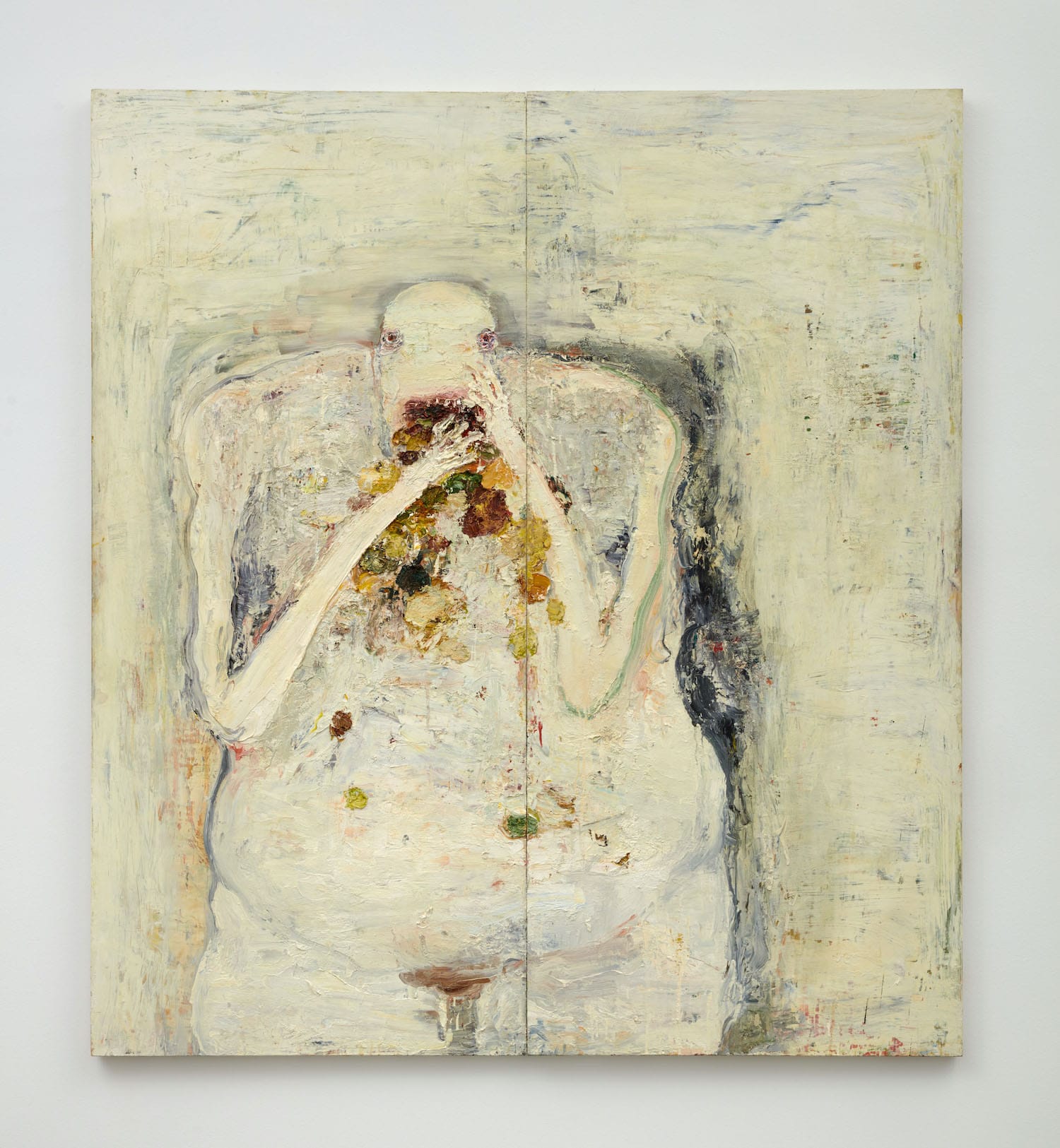 In the diptych “Self-Portrait 4A,” again working in a palette of dirty whites, Goodman portrays an oversized creature with skinny arms and a small head, earless and hairless, with the eyes placed on the far edges of the face, cramming its open red maw with gobs of paint. This is a portrait of the starving artist, of feeling both abject and overcome with a ravenous, unrestrained hunger for self-discovery.