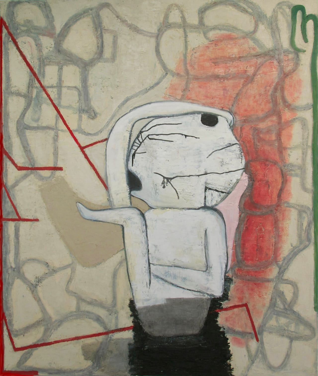 Starting with the ridged net of carefully dripped lines, every shape and patch of paint comes across as a palpable thing, many of which are unnamable. Is this figure a penitent, a bridesmaid, or a member of an unknown religious order? Our questions remain unanswered and we are left with painting.