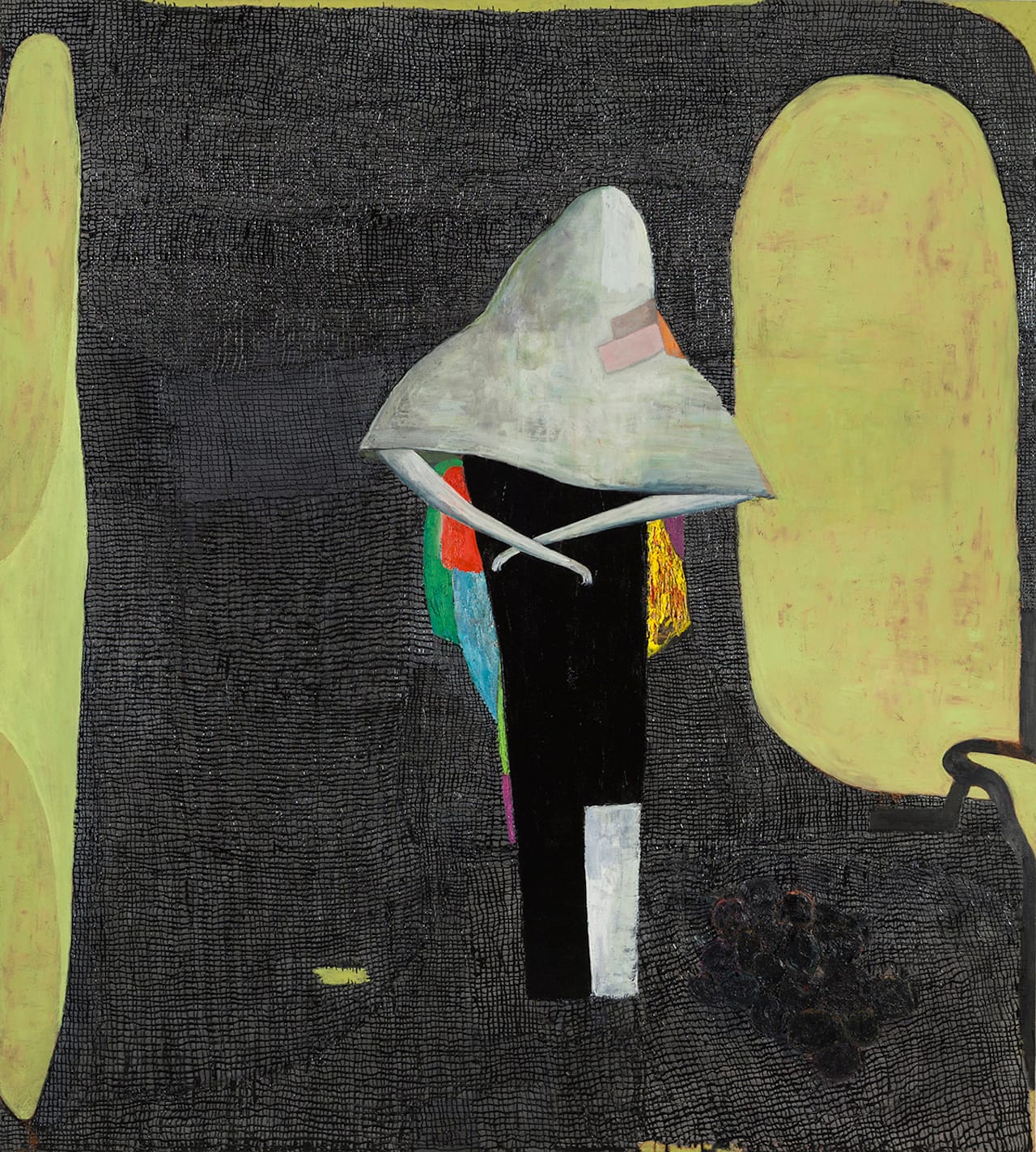 “Almost a Bride” (2015) is a strange and forceful painting that gets under your skin. A black, net-like grid of ridged lines, which the artist made by dripping paint from a narrow bottle top, covers most of the yellowish-green ground. The places where the ground is visible destabilize the figure-ground relationship. In one small area on the lower left side, the net appears to have been torn open. Aseverely dressed, hooded figure floats in the middle of the painting, contained by the grid of ridged lines around her.