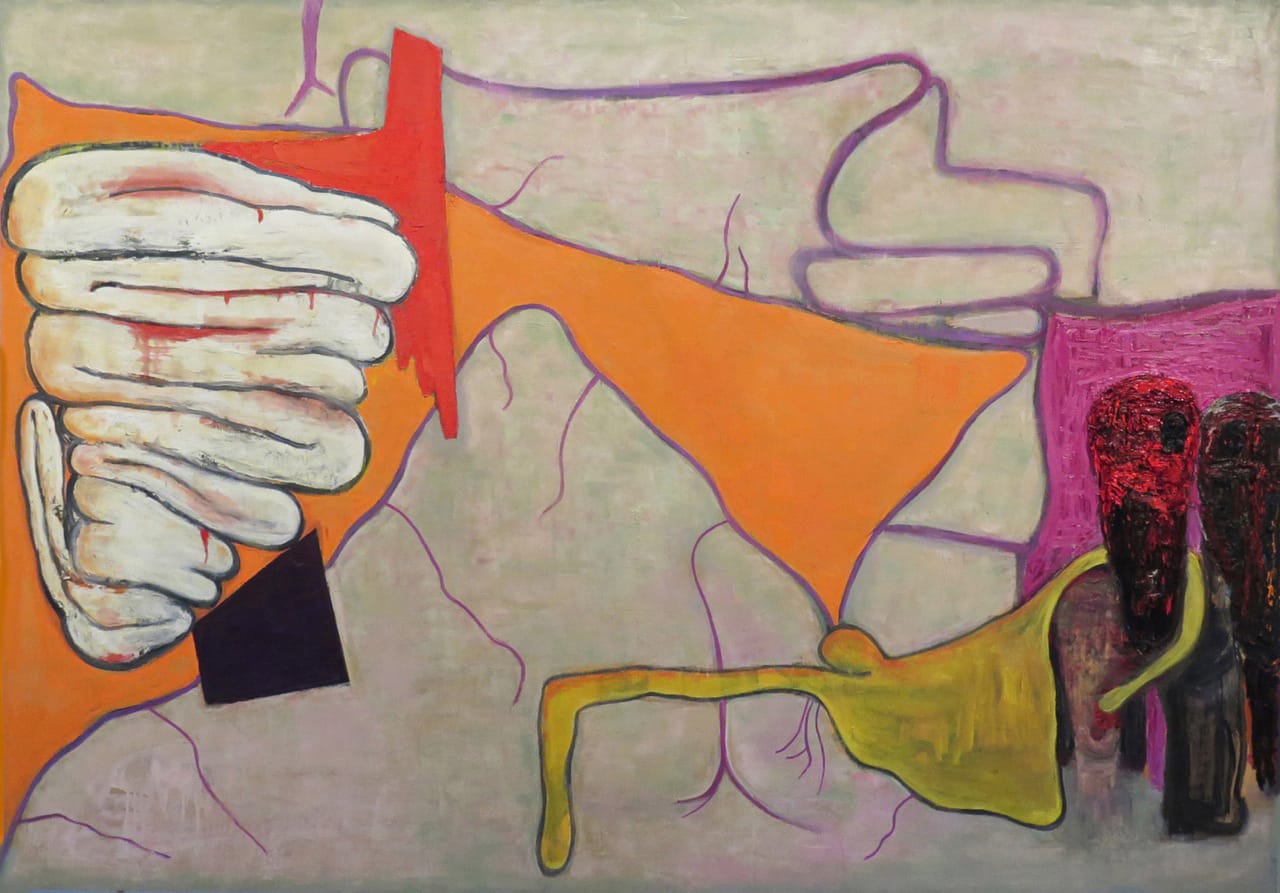 In “Jumping Out of My Skin” a grayish, neckless torso with three appendages (are they two arms and a leg or three arms?) has a roundish, boulder-like head sitting squarely on top of it. Most of the black lines on the head can be read as scars, while another suggests a lipless, frog-like mouth. One black circle (or eye) on the top right side, adjacent to the edge, suggests the figure is looking to the right, while another black circle on the lower left side (also adjacent to the edge) implies that the head is cocked and looking directly at us. Goodman has made Picasso’s simultaneous views go haywire.