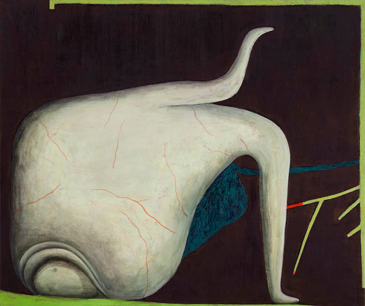 Possibly lying on its back, the ungainly, armless creature in “Euff” seems both human and slug-like, sporting two different-sized tentacles that may or my not be legs. Are the crooked red lines marking the creature’s body veins or scars? What is the meaning of the green bar running along most of the painting’s top edge and right side, with four thin branches, two of which are tipped in red, extending from the lower right side towards the creature? Is it a prod or possibly another form of life? There is an internal logic to the painting that holds the viewer’s attention, even as it refuses to give up its meaning. Confronted by a wide array of unanswerable questions, the painting is bewildering and disconcerting. It is Goodman at her creepy best.