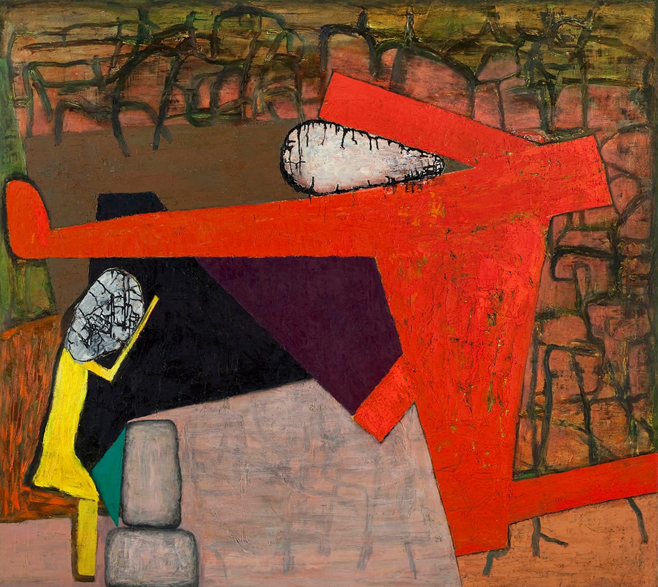 In her recent paintings, which look like no one else’s, Goodman has both synthesized and transformed aspects of all her earlier periods. She has also added new ways of applying paint, with a vocabulary that includes impasto surfaces; preternatural forms; geometric shapes; figuration; abstraction; paint dripped from a bottle; compressed space; unstable figure-ground relationships; drawing in paint.. She has internalized facets of Surrealist, Expressionist, Symbolist and geometric artists until they are recognizably hers.