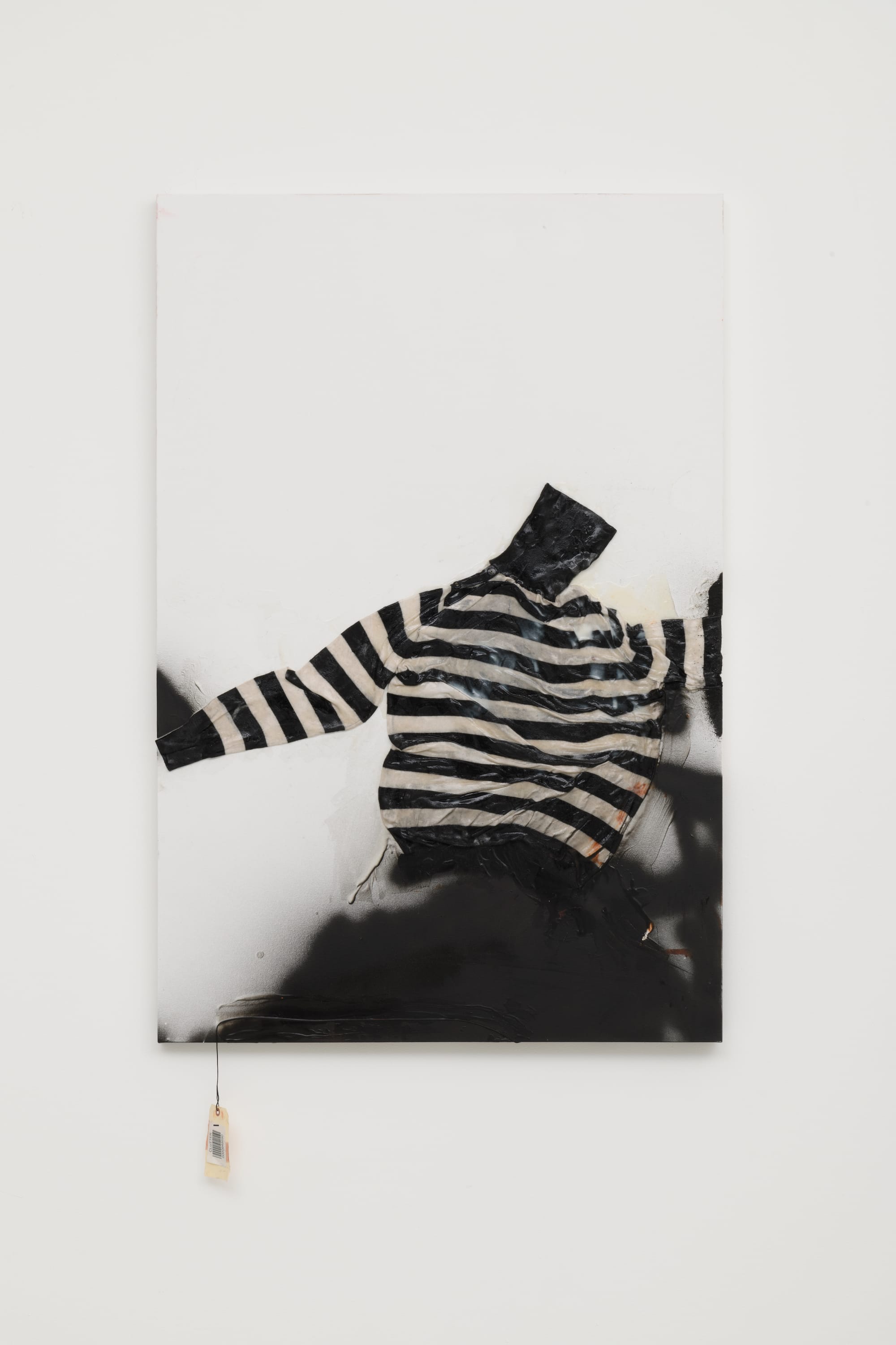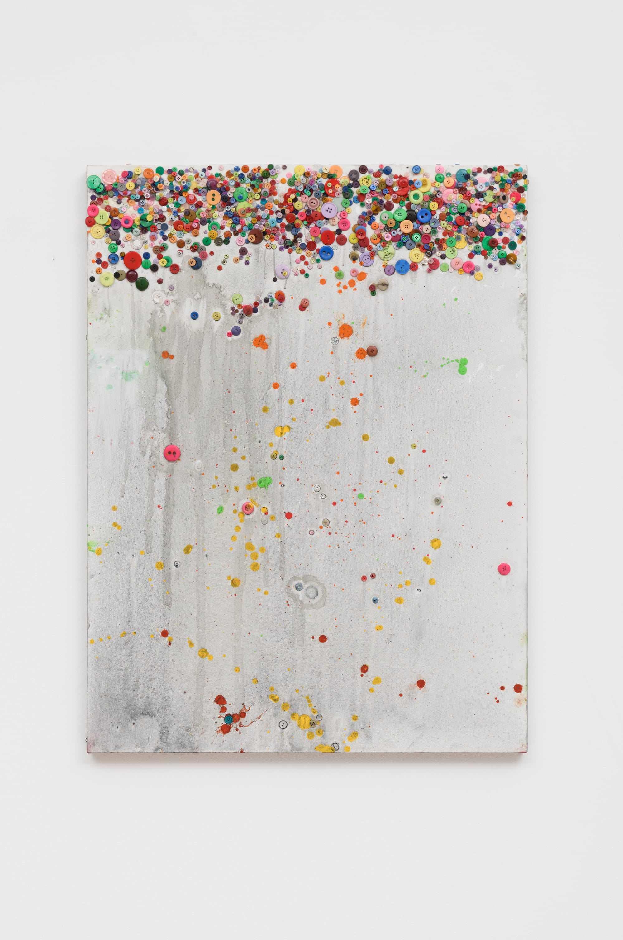 LOS ANGELES — A black and white sweater, a hoarder's worth of buttons, slip-on shoes, a brittle “No Parking” sign. These found materials interrupt the abstracted surfaces of Brenna Youngblood’s paintings in ways that would probably make Piet Mondrian yelp. Mondrian believed abstraction could only tap into the universal harmonies of life if it shunned the crudeness of reality in favor of simplified forms. His view, utopic and myopic at the same time, left its mark on 20th-century styles and movements, from Color Field painting to Minimalism. In her new solo show at Roberts Projects, the LIGHT and the DARK, Youngblood reassembles and revises the language of abstraction, embedding the traces of everyday living — discarded items, personal mementos — onto canvas and boards. Their inclusion, layered over periwinkle transparent washes and puckering impasto, plunge the viewer into a landscape where memories crash against the formalities of abstraction.