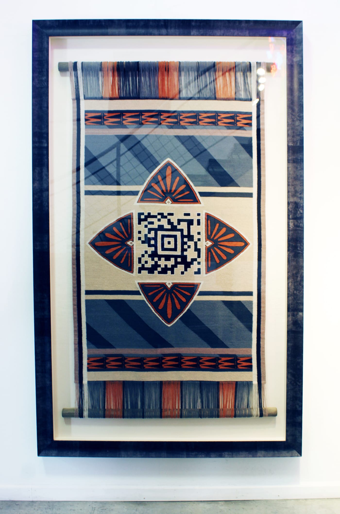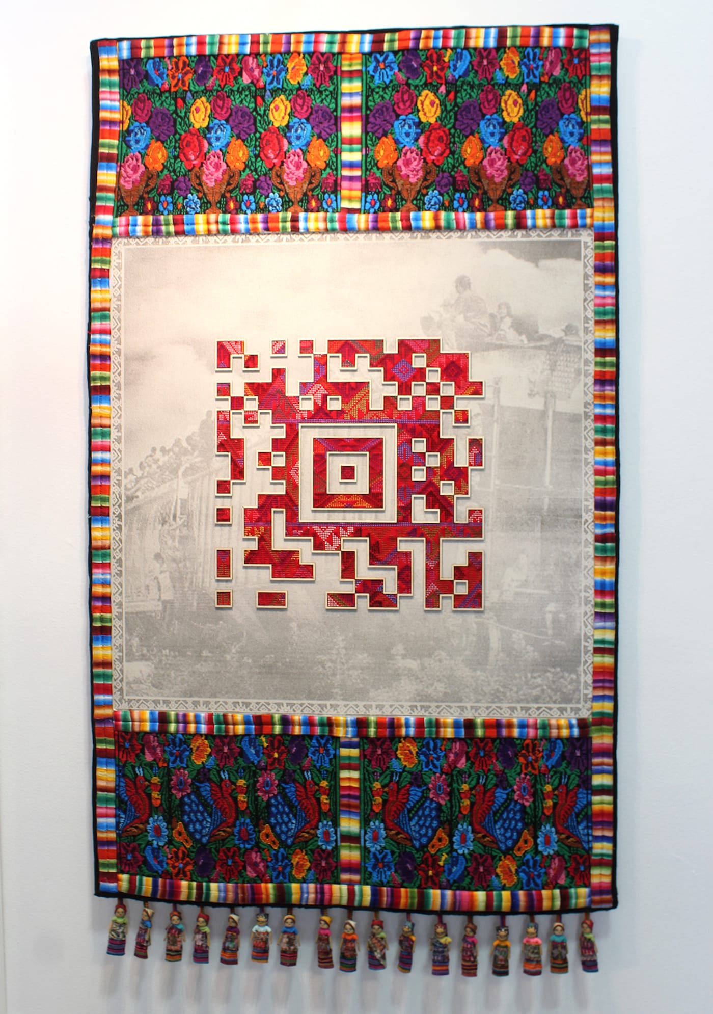 Guillermo Bert, inspired by the graphic similarities between modern QR codes and indigenous craftwork from regions in Latin America, collaborates with Mayan, Mapuche, and Acoma weavers to create tapestries that tell these communities’ stories. Titled Encoded Textiles, the pieces’ bold centers are working QR codes that play video and audio about each respective tribe when scanned with a smartphone.
