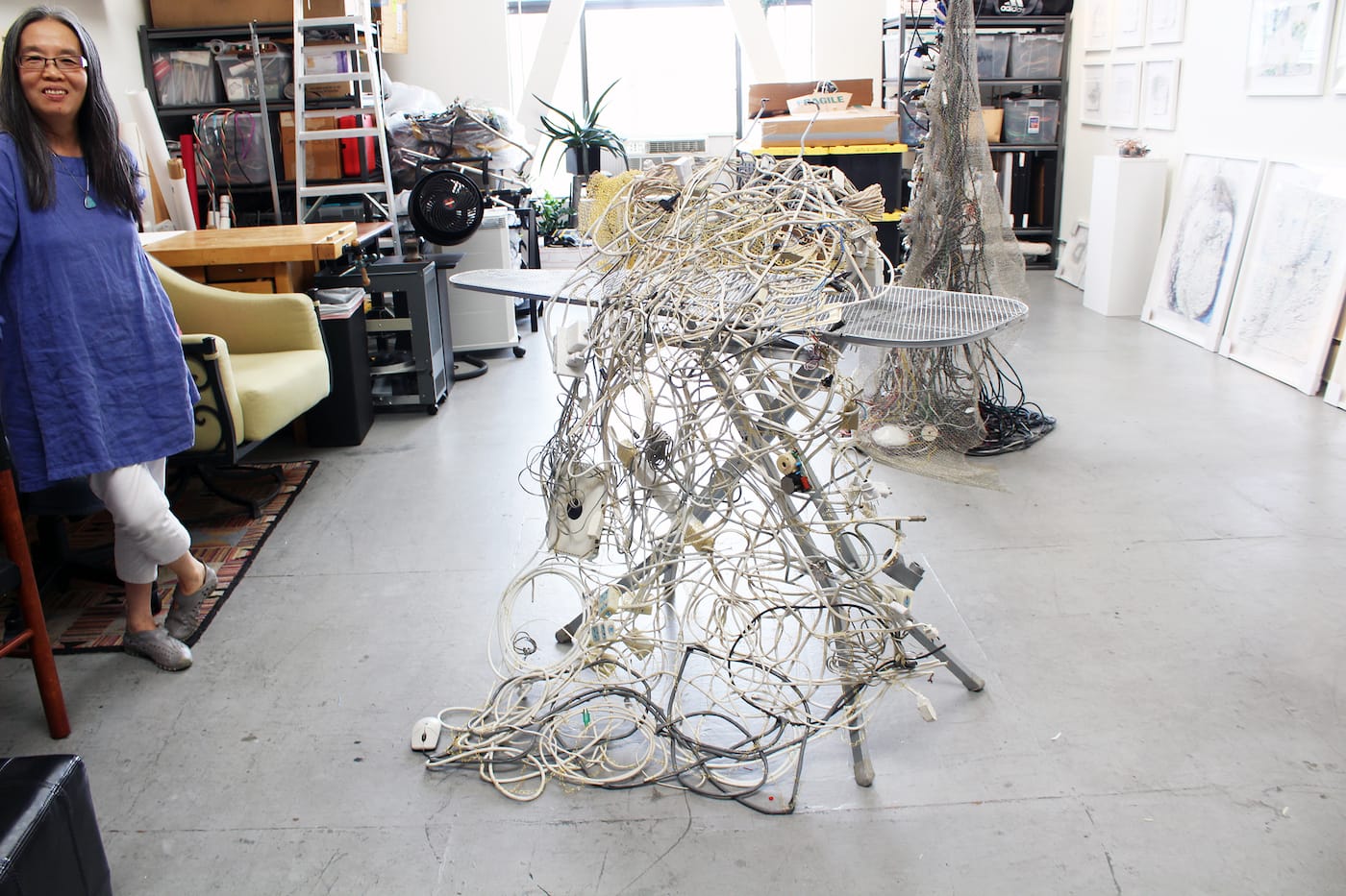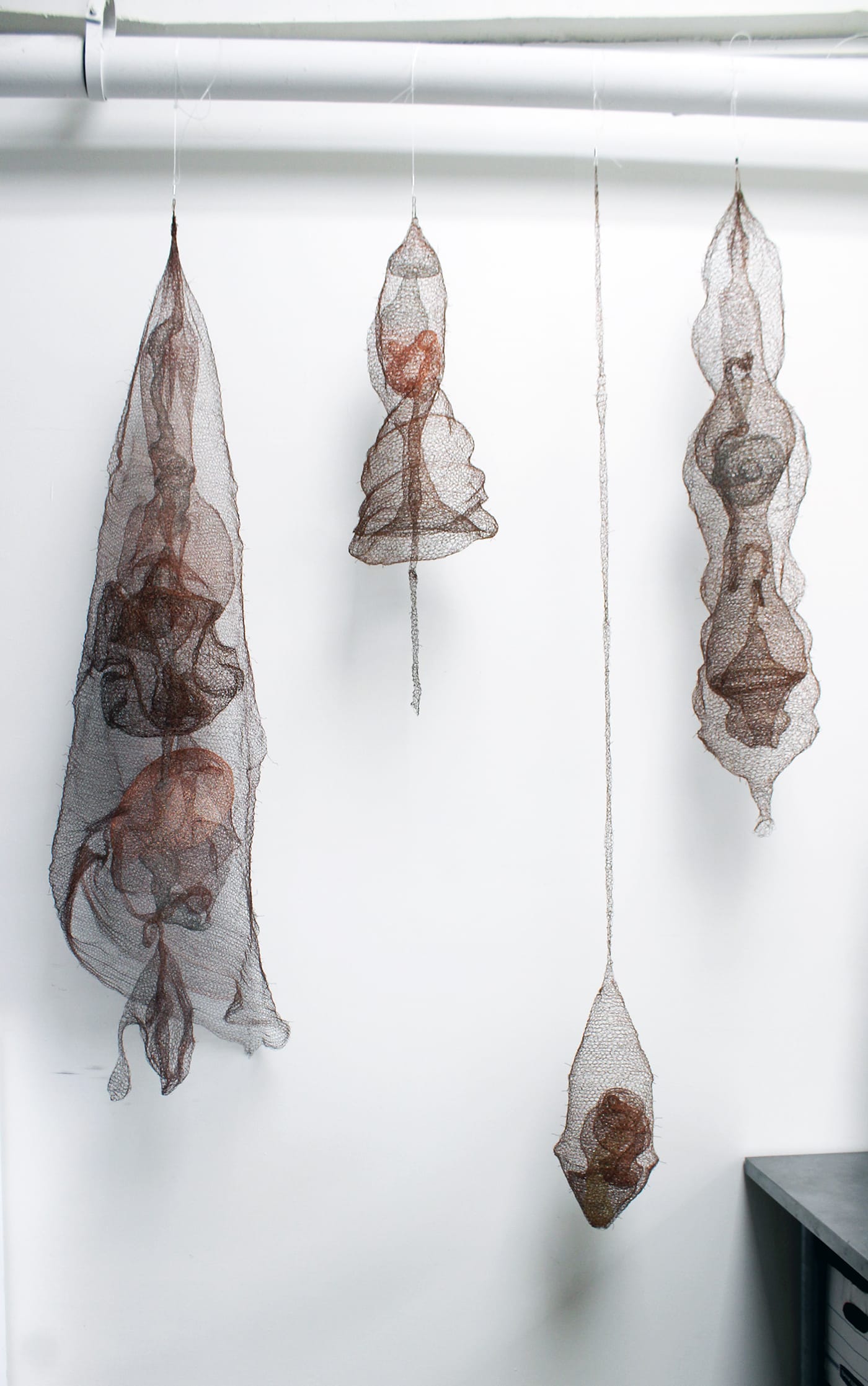 One such theme is an attempt to preserve personal artifacts and memories with modern technology. In Chenhung Chen’s interwoven sculptural works from her Entelechy series, she crochets copper stripped from electrical wires into delicate netting and suspends knots of auxiliary cords into flowing entrails that recall the human body.