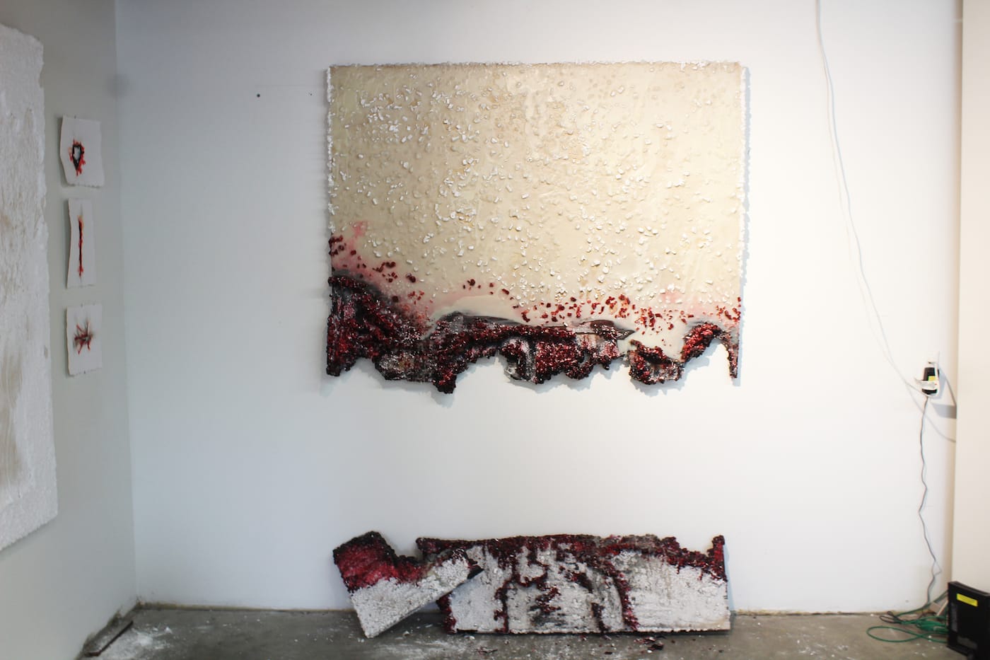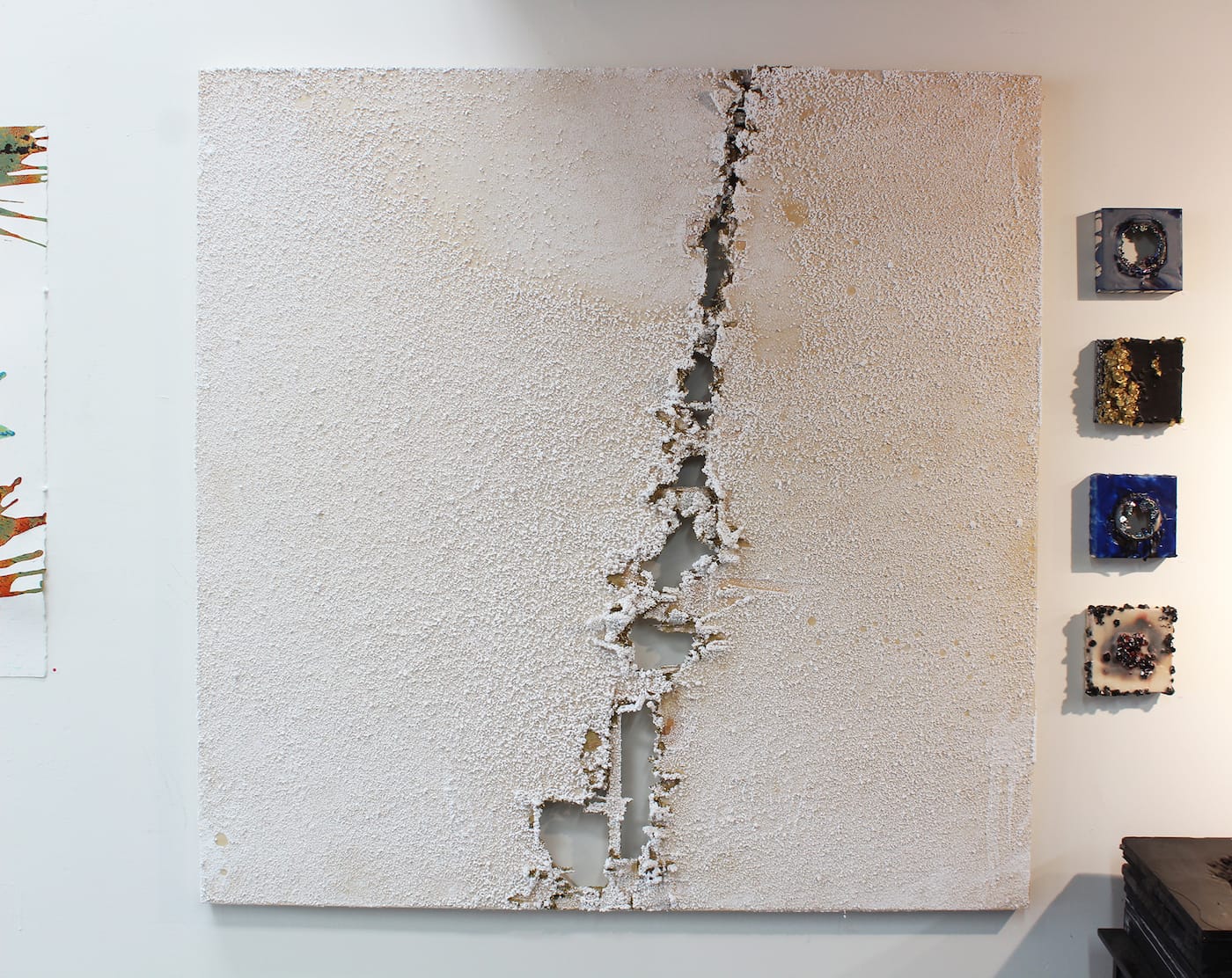 Playing the role of a geologist, Randi Hokett’s beautiful and violent crystal works show how texture can transform a surface. She applies a special mixture directly onto the canvas, which fuels the growth of borax crystals. When the surface looks just right, Hokett burns, hammers, or tears away at the work to destroy visual harmony, resulting in works that resemble scars or fissures.
