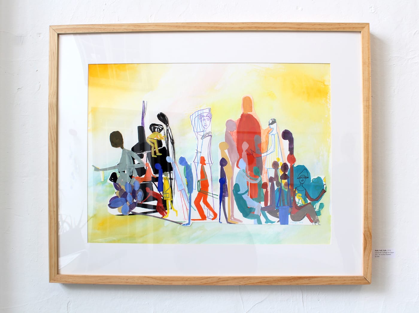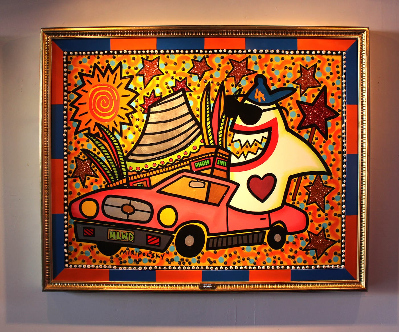 Other artists expressed pure, childlike joy in their bright, campy paintings. Caley O’Dwyer’s illustrations over oil and acrylic paint show whimsical snapshots of city life, while Andre Miripolsky channels the laid-back spirit of Los Angeles with his grinning, angelic sharks. Miripolsky’s creatures dance around Pink’s Hot Dogs and cruise past the iconic TCL Chinese Theater on Hollywood Boulevard. Vibrant, glittering, and a little bit kitschy, Miripolksy’s sharks are having the time of their lives, and those good times begin in the Brewery.