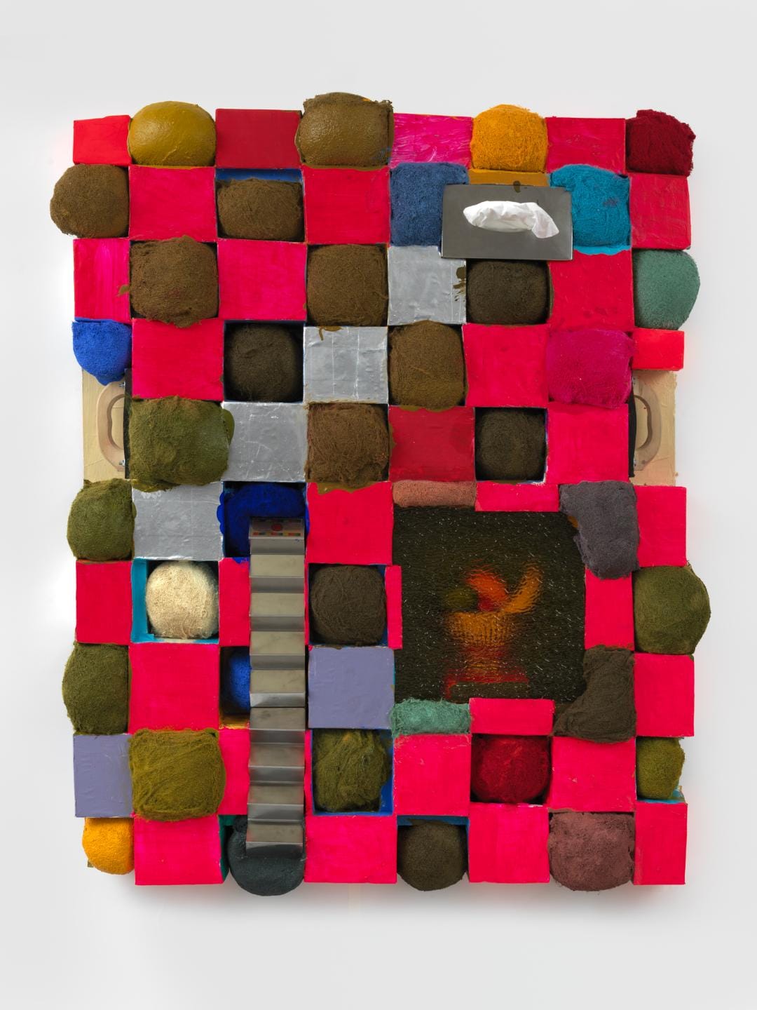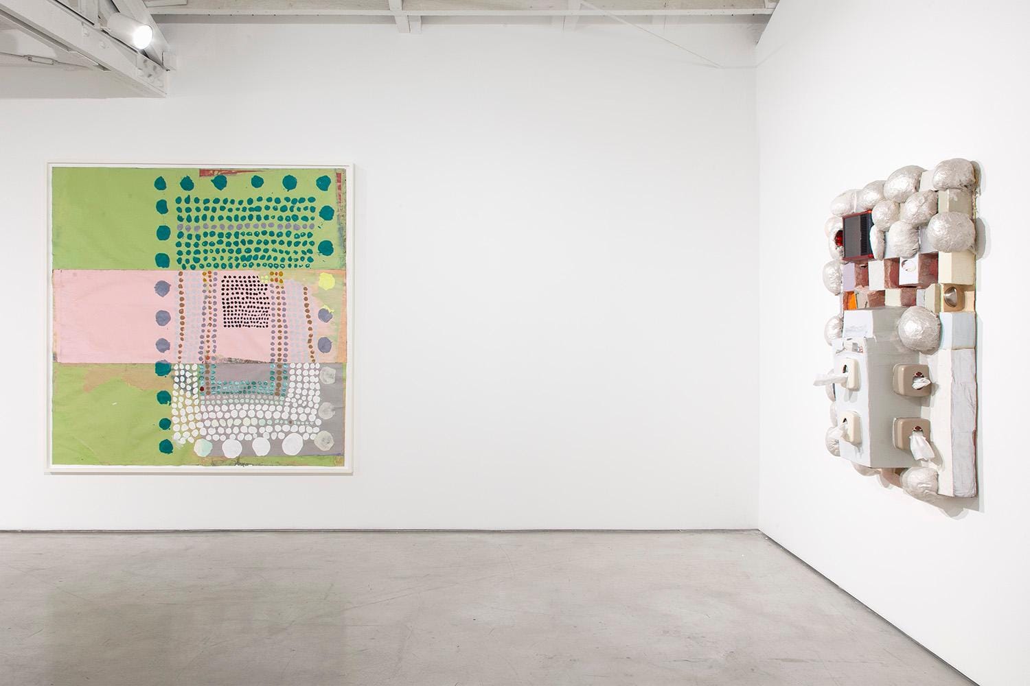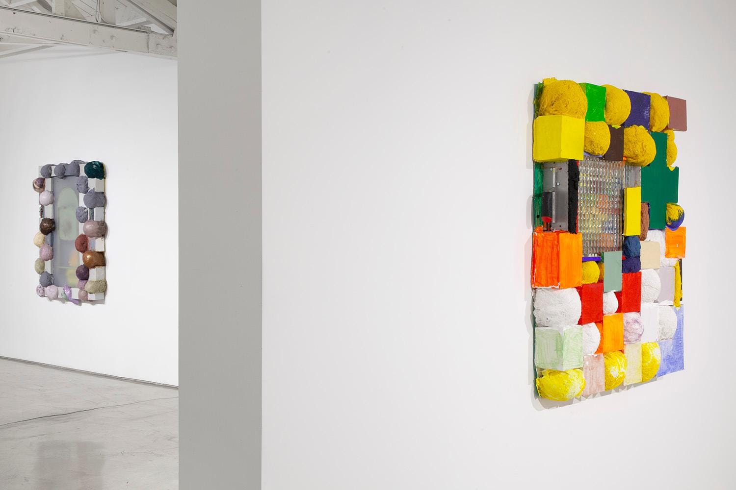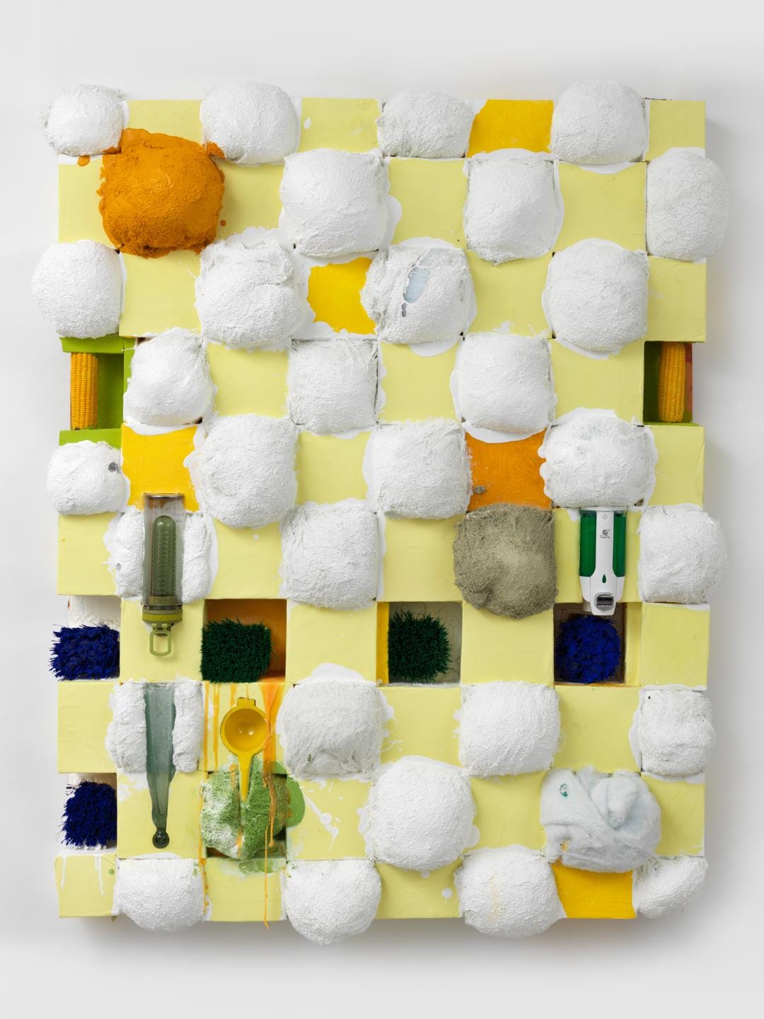 The tondos are accompanied by eight large rectangular works, most following the same relief grid format, with independent mixed-media clusters in some cases. Typical of Belott’s practice, a range of objects are integrated into the paintings, including bowls of plastic fruit, a taco tray, boxes of tissues, a space heater, a lemon juicer, fake corn cobs, a folding chair, and a dispenser of hand sanitizer. These items all address the needs of the body: to be warm, clean, and rested; to sneeze or wipe away tears (visitors are welcomed to take tissues from the paintings); and to eat — the foods are fake, but they make the point. Belott seems to be thinking about nurturing, in the sense of being physically and emotionally cared for, or caring for others, as well as feeding ourselves creatively, as we do with art. Both senses are apparent in “Untitled (corn puff)” (2019), a lemon-yellow and white painting based on his grandmother’s kitchen: Grandparents’ role is to provide their grandchildren with love, food, and toys, while the kitchen is the nutritive, and emotional, center of many homes.