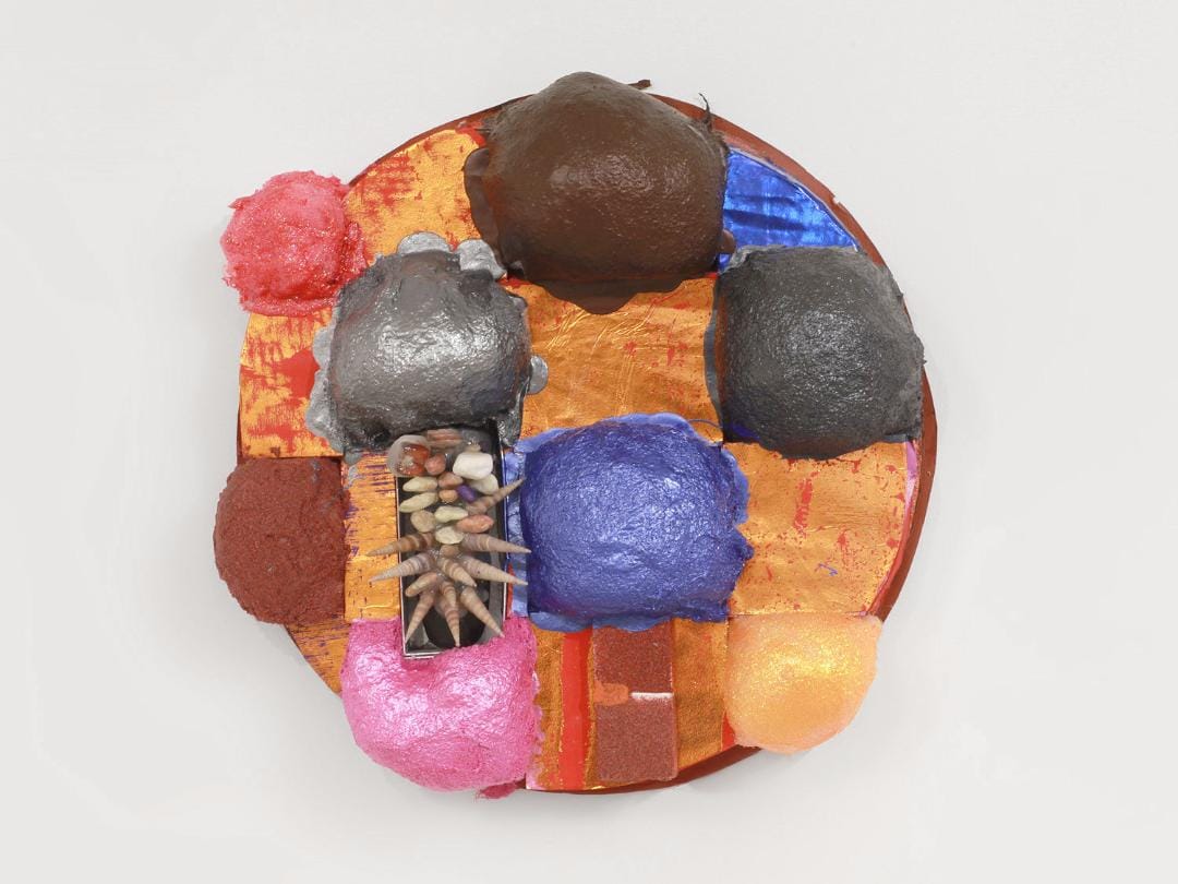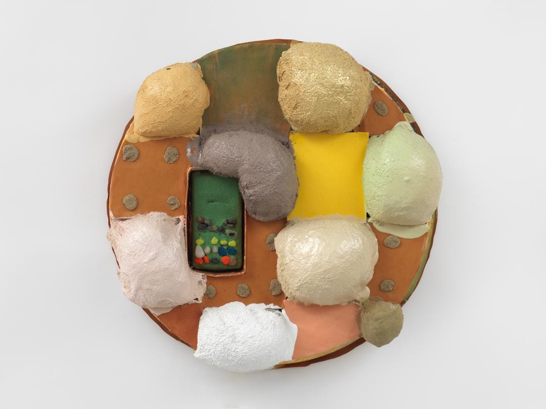 A painted television remote is recessed within each tondo, like the figure of a saint in a niche, its buttons are covered in pebbles or shells, as though the object has regressed to a pre-technological state — or a kid decorated it with whatever might be on hand. This gesture is in keeping with Belott’s longstanding fascination with children’s drawings and paintings (his 2017 exhibition at Gavin Brown’s Enterprise comprised a large archive of children’s art).