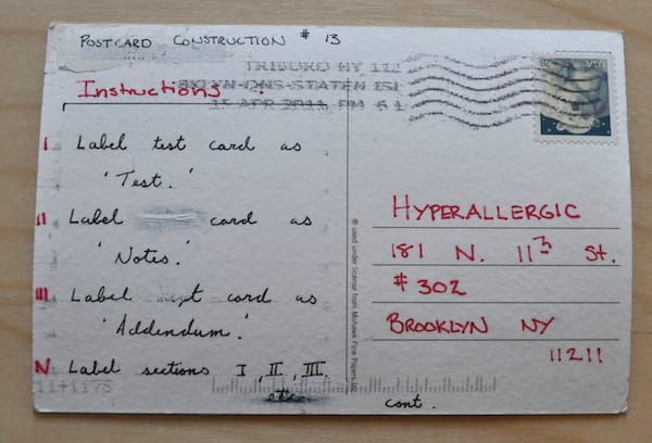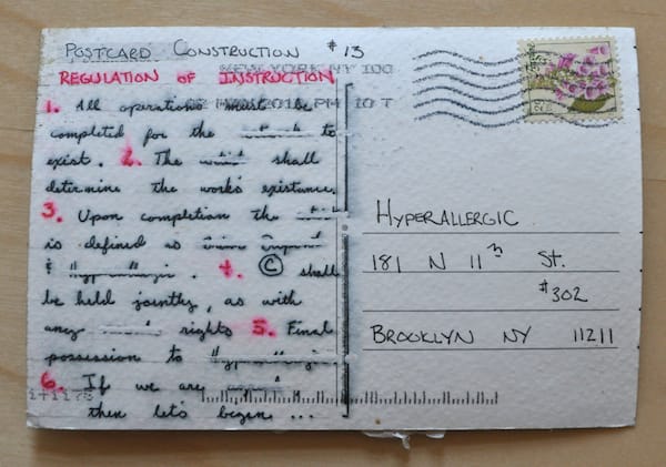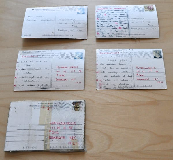 Dupont’s contribution to the Mail Art Bulletin is a five-part postcard project that began to arrive at the end of March (postmarked March 29, to be exact) until the beginning of this month (postmark May 9), when we received an instruction “book” of sorts.