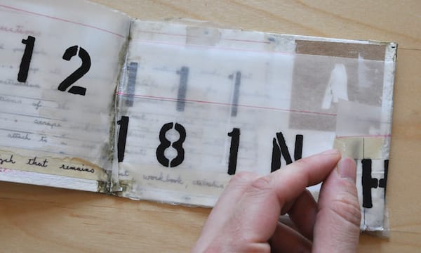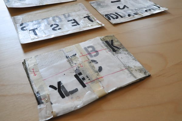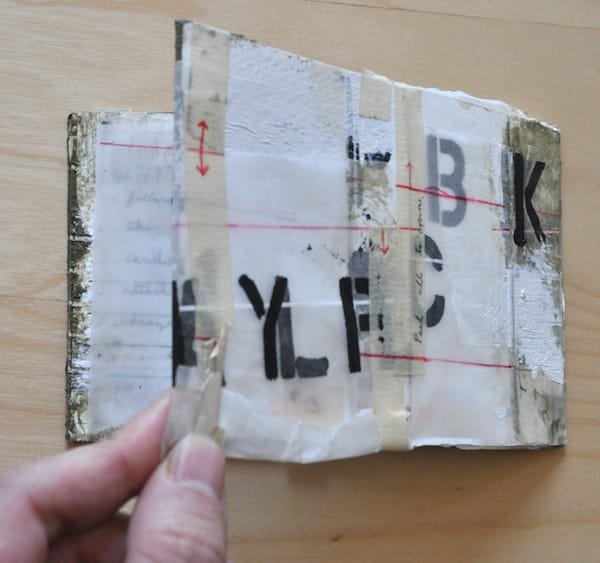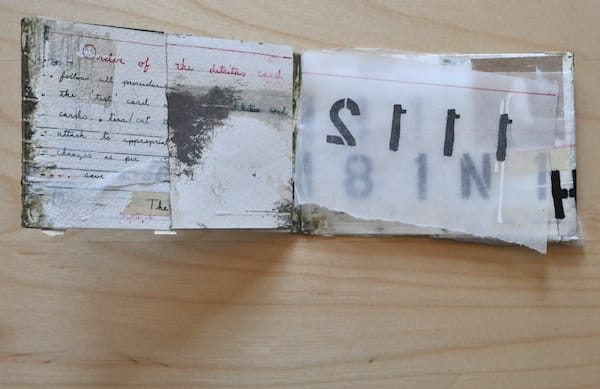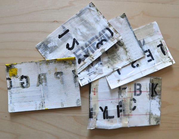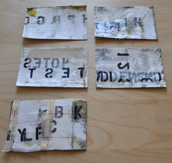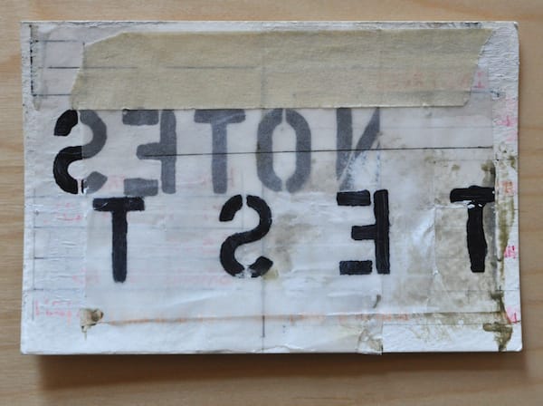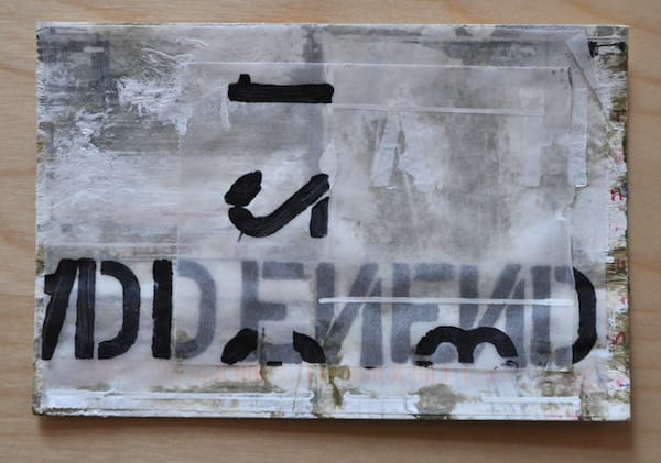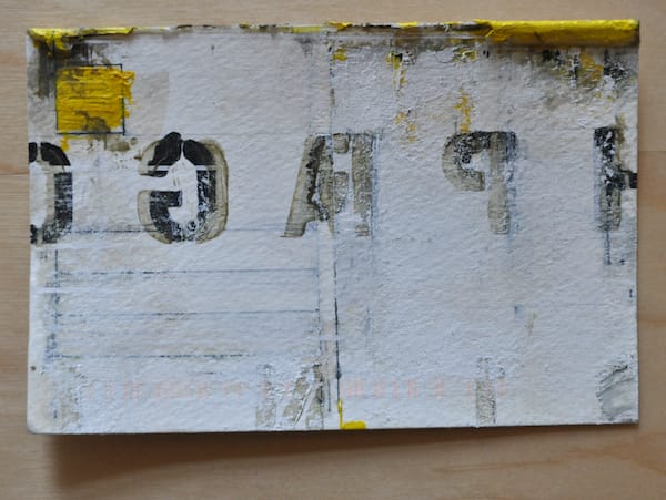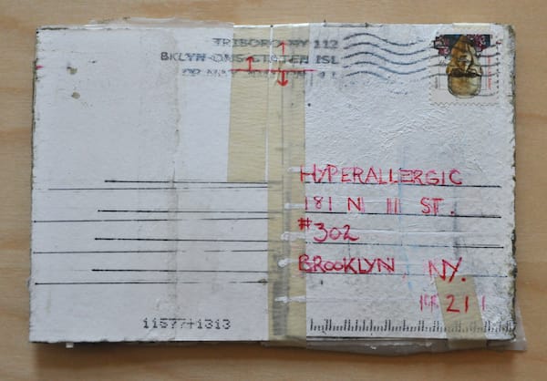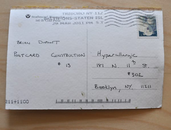 As each postcard arrived, I initially assumed they would offer insight into the larger work but they only generated more questions, like objects from an archeological dig. According to his “In Process” tumblelog, these aren’t the first mail art works the artist has created and in a wider context they appear most related to his Text Paintings, which include similar stenciled letters on washes and bands of color. The scrapping and handwritten cursive script give the work the patina of age.