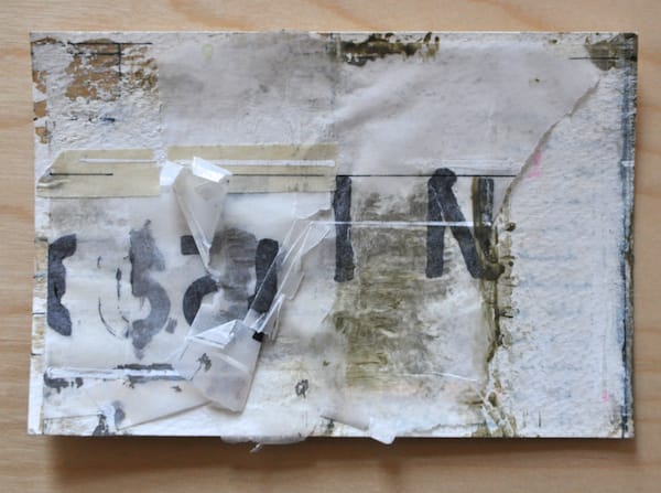 Each postcard is created on thick watercolor paper, and they arrived with stenciled letters. The postcards were created in Dupont’s characteristic scraped and layered style. Tape, ballpoint pen and wax paper were added to the textured paper and they make the work feel like a relic from the early 20th C., as if they were cut out of some avant-garde advertising storyboard. My mother worked as a graphic design for two decades and these layers of tape, stencils, translucent paper and random arrows and words evoke the member of the camera-ready work she would carefully prepare for pre-production. They are objects designed to communicate, but here they often obfuscate.