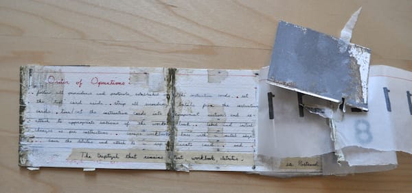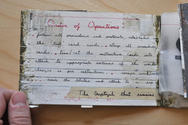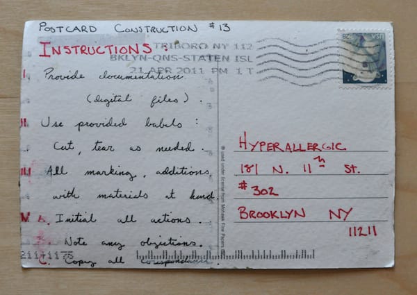 From what I’ve been able to discern from the work, “Postcard Construction #15” (2011), it appears to be a record and road map of its own creation. As much a conceptual work as a physical one, and I like the thought that the objects are fragments of a larger meaning that got lost in the mail.