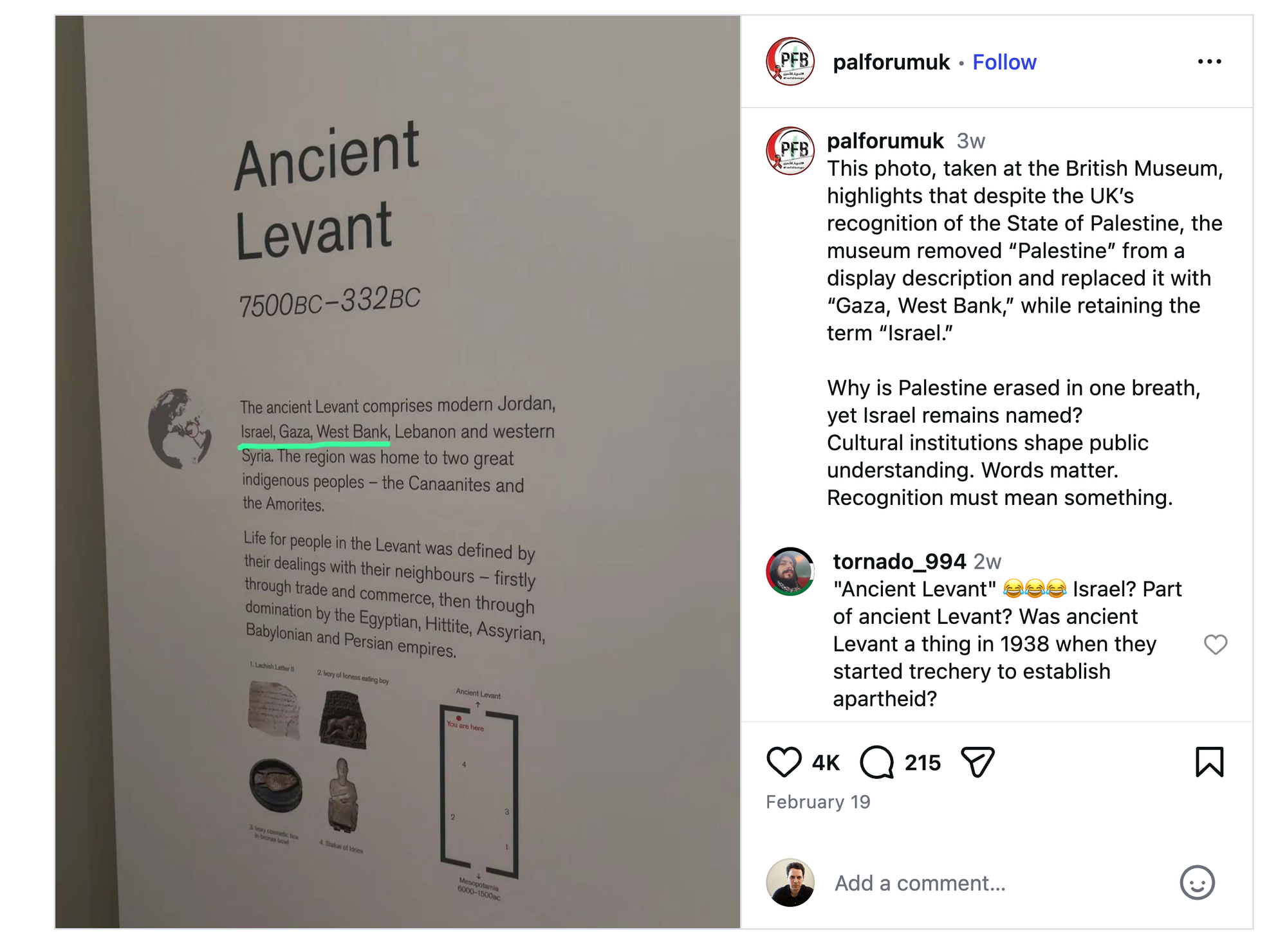 After news of the display alterations broke, the Palestinian Forum in Britain posted an image showing a wall text at the museum describing the Levant region as comprised of "Jordan, Israel, Gaza, West Bank, and western Syria," but committing the use of the term Palestine.