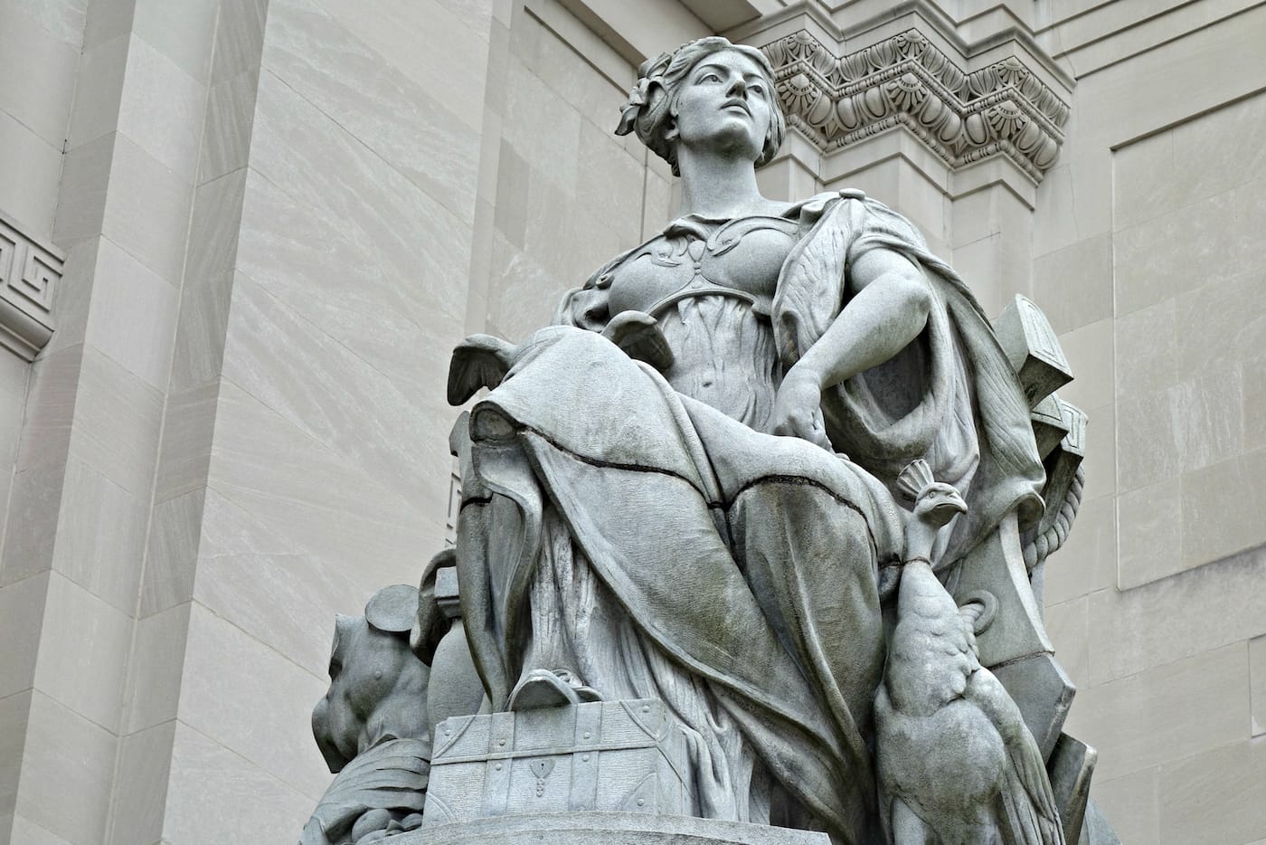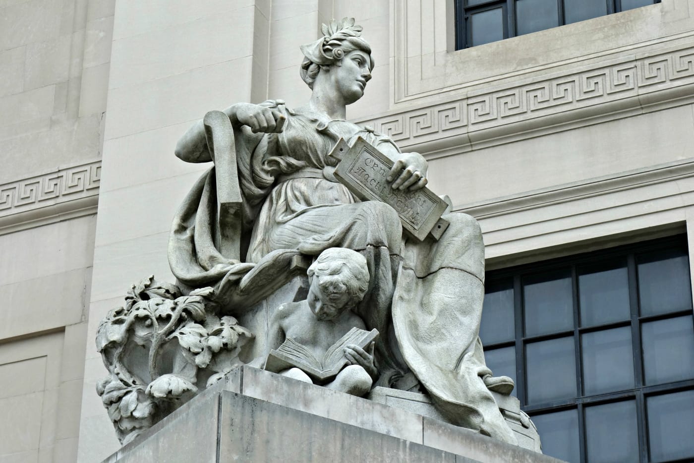 On one side of the plaza, “Miss Manhattan” sat with her chin raised, a symbolic chest of wealth beneath one foot. A proud peacock stood at her left, and a classical sculpted torso at her right, an anchor behind her back suggesting waterfront commerce. “Miss Brooklyn,” meanwhile, was softer, her neck tilted, a child reading at her feet near a burst of foliage, a church in miniature on the opposite side, and laurels resting on her head. French is said to have used Audrey Munson as the model for both. As previously covered on Hyperallergic, Munson was a popular Gilded Age model, nicknamed the “American Venus,” who also appears in Adolph Alexander Weinman’s “Descending Night,” and Alexander Stirling Calder’s “Star Maiden.” She later fell into obscurity and died nearly forgotten in a mental institution in 1996.