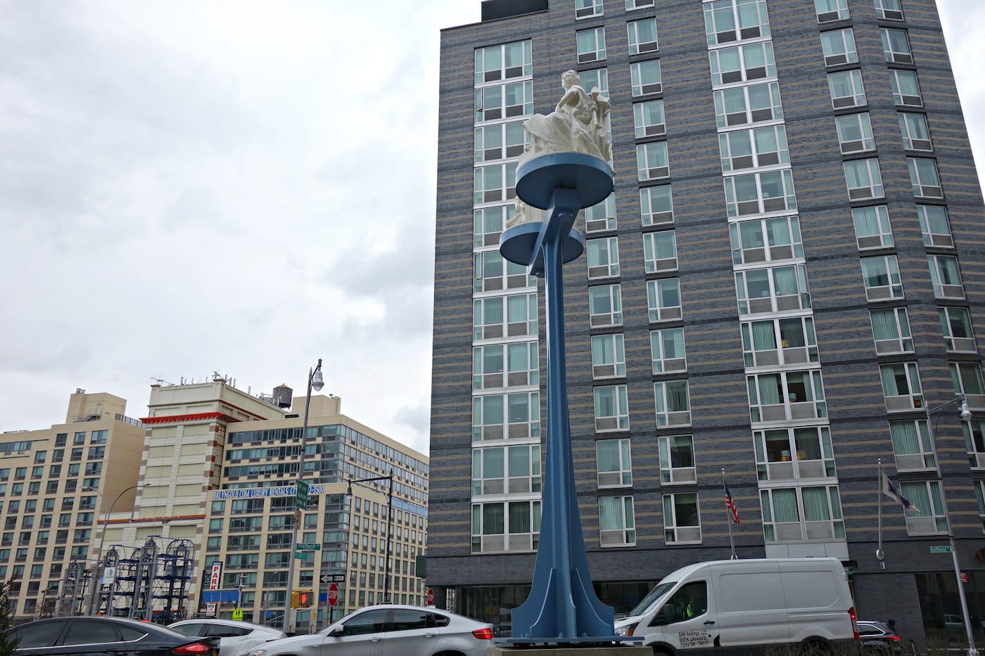 More than 50 years since they were removed at the behest of New York’s “master builder” Robert Moses, two allegorical statues of “Miss Brooklyn” and “Miss Manhattan” have returned to the entrance of the Manhattan Bridge. Located at the intersection of the Flatbush Avenue Extension and Tillary Street in Downtown Brooklyn, the once-lost ladies are part of a new permanent sculpture by Brian Tolle. However, they’re not as statically regal as when they debuted in November of 1916; now they are spinning slowly on an over 24-foot-tall pedestal, colored the same low blue as the steel on the bridge. And at night, they’re lit from within, the illumination giving their cast white acrylic bodies a bright glow.