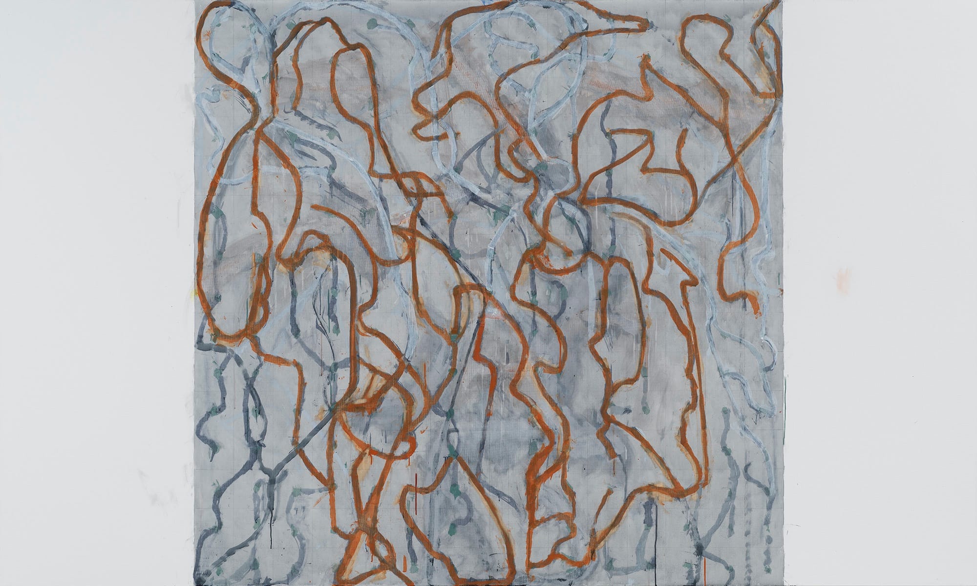 In “March” (2018-2019), the composition’s flanking gray bands help concentrate the viewer’s attention on the faintly gridded square overlaid with hesitant red-brown, gray, and dirty-white, ribbon-like lines tangling and untangling across the center of the painting. In some areas, Marden layers lighter gray brushstrokes over darker gray ones. Look at the brushstrokes closely enough and you can see where he stopped the brush before turning or shifting direction. By leaving the record of his process bare, like a winter landscape, Marden exposes his vulnerability, uncertainty, determination, and persistence. The hesitations – at once deliberate, awkward, and vulnerable – fill the painting with feeling, all of which is further underscored by the chilly colors and the stains that are left when the artist has used turpentine to wipe out a mark.