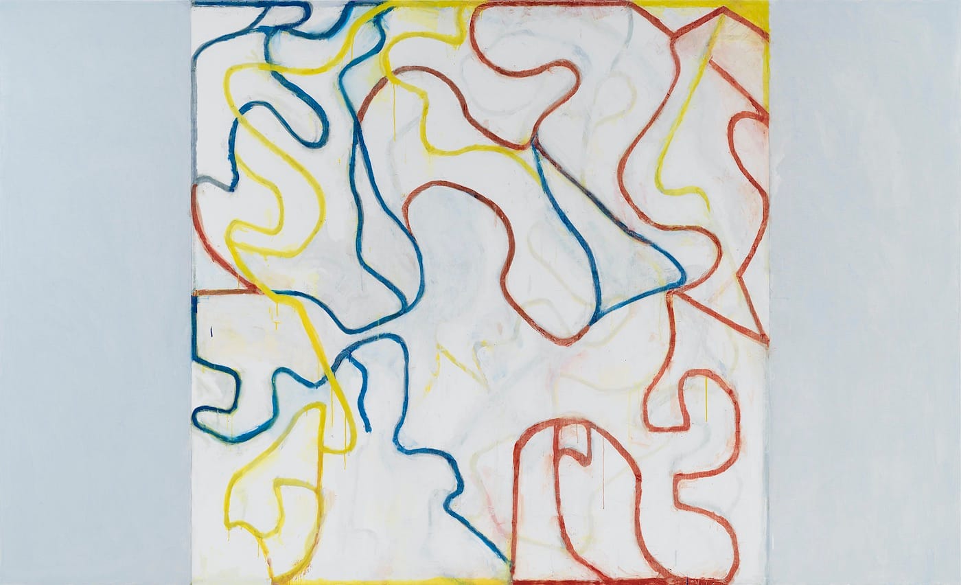 In “Withwhite” (2018-2019), whose blue, red, and yellow ribbons of paint on a milky-white ground contain faint traces of earlier brushstrokes, Marden is engaged in a dialog with Willem de Kooning’s late paintings and more than holding his own.