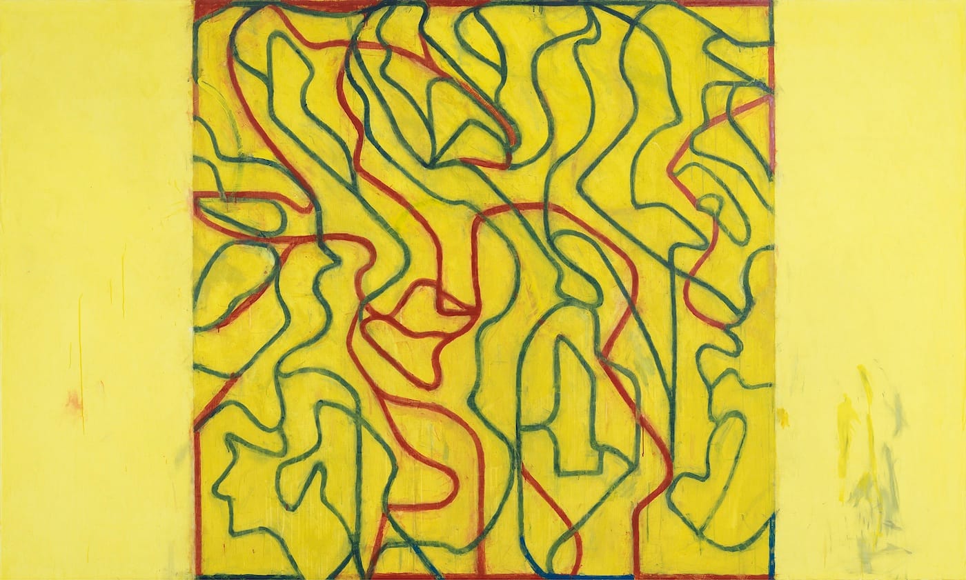 If, at times, as in ‘Yellow Painting” (2018-2019), the shapes made by the overlapping red and green lines remind you of a jigsaw puzzle, the fact that they don’t fit together is part of the painting’s meaning. The drips and faint traces of earlier marks enact a form of dispersal, our unavoidable destiny. This underscored by the cluster of marks, as if Marden wiped his brush on the painting’s yellow band on the lower right hand side.