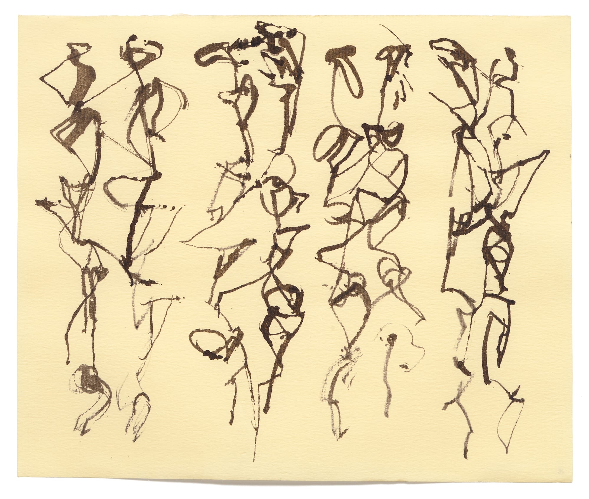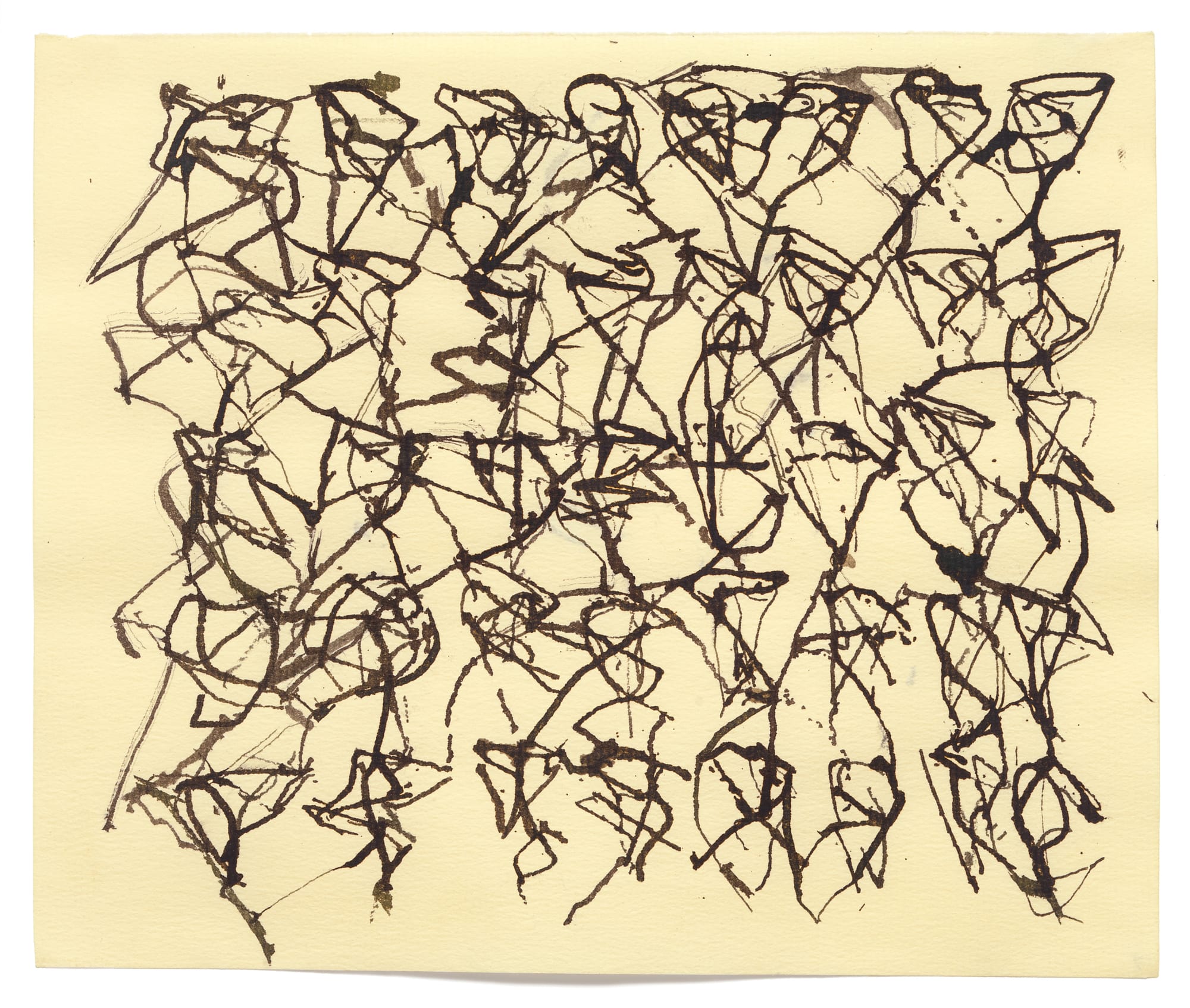 In the years that separate his monochromes of the 1960s from the gestural paintings he first made in the late 1980s, Marden assembled large, smooth rectangles of color in configurations rife with architectural allusions. Post-and-lintel construction was a frequent theme. Then, as he explained to the painter Pat Steir in a 1991 interview, he felt the need to paint in a way that registered who he is “physically” — a left-handed person of a certain height and weight. In place of brushes, he used long, limber sticks that distanced him from the canvas. What appeared were like read-outs from a self-aware seismograph. Drawing in ink, Marden works with the wrist and fingers, not shoulder and arm, and the instrument is, of course, much smaller. In the Cold Mountain Studies, he covers paper sheets with quick bursts of linear energy; some drawings are spare, some intricately tangled. Each is the trace of a transient intention, and their variety is potentially infinite. No consideration of style or meaning regulates these marks, yet they appear on the page in orderly rows; and even when the rows merge to produce an allover field, Marden maintains a serene relationship between empty and occupied portions of the surface. The two-dimensional architecture of these Studies is not only solid but off-handedly beautiful.