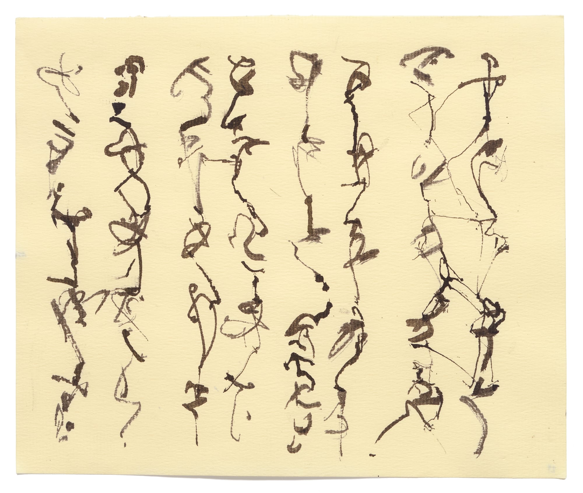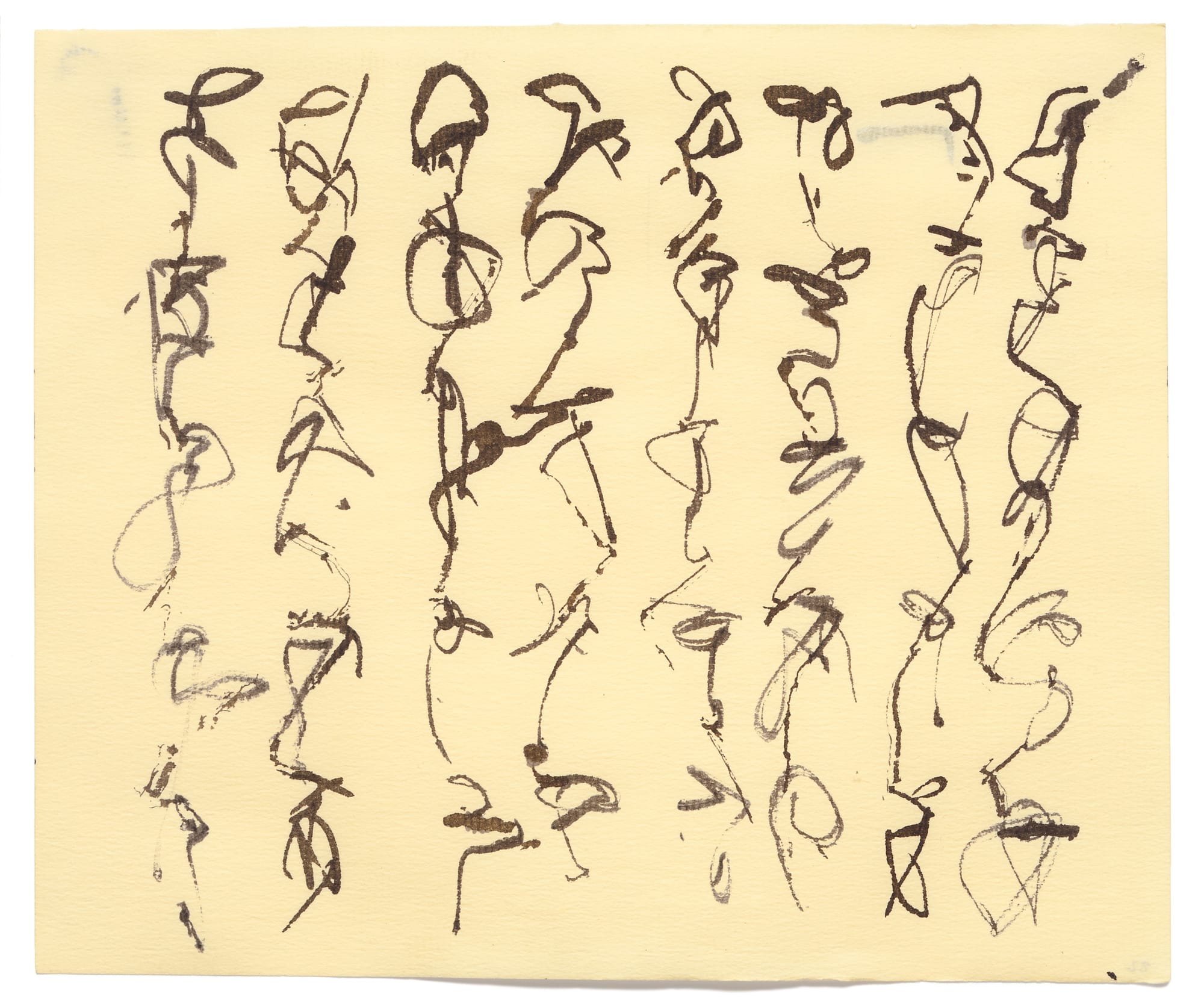 When Marden was starting out in the 1960s, one heard much talk about “activating the surface” — in other words, generating enough pictorial incident to turn the inert expanse of the canvas into a visually engaging picture plane. The surface activation in his monochromes was extremely subtle, limited to faint, almost imperceptible traces of his palette knife. The determination to activate the surface is conspicuous in The Cold Mountain Studies, but still subtle: every mark of Marden’s pen is shaped by a fresh and elusive nuance. Sometimes the torque moving through a line sends it twisting into depth, activating the space of the image — or bringing that space into being, for we tend to read these Studies as marks on depthless surfaces. The ancestors of Marden’s drawing papers are scrolls inscribed with the Cold Mountain poems that led him to Chinese calligraphy. He was attracted by not only the configurations of individual pictographs but also their organization into couplets, with five or ten characters in each couplet. This format appears, modified, in many of the Cold Mountain Studies and gives them their air of wide-open orderliness.