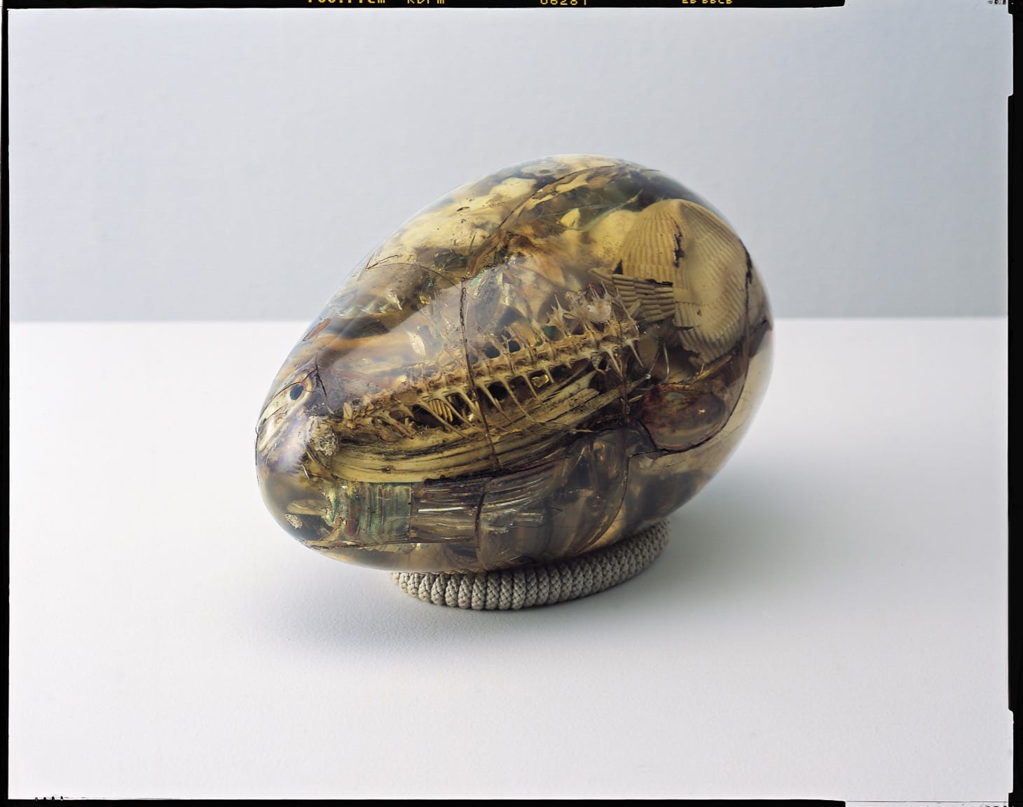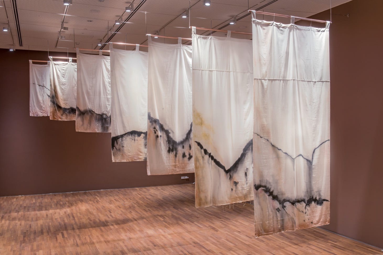 The artists in this landmark exhibition introduced new methods and materials to visualize the arts as a natural part of our lives. In other words, “everydayness” links life and art. The artists such as Nomura Hitoshi (Japan, born 1945) who makes sculptures with dry ice, Nakanishi Natsuyuki (born in Japan, 1935–2016), or Tang Da Wu (Singapore, born 1943) investigated the natural state of everyday objects and the interactions among them, rather than arranging them to deliver a certain meaning to viewers. Nakanishi’s “Compact Object” (1963) which contains beads, necklaces, egg shells, hair caps, bottle caps, and other objects embedded in an egg-shaped resin metaphorically visualizes the debris of mass production and consumer culture. Some artists added the concept of temporality to their work made of everyday objects. In Tang Da Wu’s “Gully Curtains” (1979), the natural environment creates temporality. In a ditch in his neighborhood, where all the buildings had been demolished for redevelopment, he buried seven pieces of white fabric for ten days. Soil and rainwater impregnated the fabric, leaving unique patterns. As Tang stated, “I was not trying to dominate the material completely, but was interested in creating a relationship with the material.”