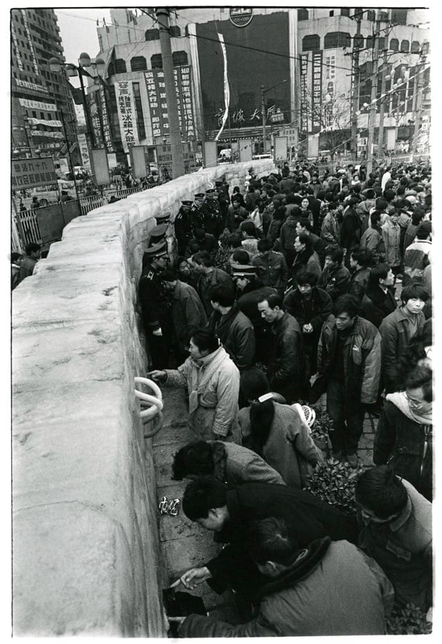 In the second and third sections of the exhibition, the scope expands to examine the relationship between art and society, asking “What is the role of art in the socio-political context?” The influx of western capitalism created a culture of consumption and a mass media, particularly in the cites. At the time, artists feared that capitalism would destroy existing communities and the local culture. Consequently, they developed a dialogue resistant to the government that led industrialization. To these artists, the “city” is the center of capitalism and serves as an alternative space to communicate with the public. In 1996, Wang Jin (China, born 1962) installed a 33-yard-long ice wall in the shopping mall square in Zhengzhou. In the wall, he put a thousand high-value consumer goods such as watches and mobile phones. Of course, the crowd began to crush the wall to grab these goods. Wang Jin transformed the public’s desire to possess in a market economy into an unconscious collective performance, and today’s audiences can witness the performance through seven black-and-white photographs on the wall.