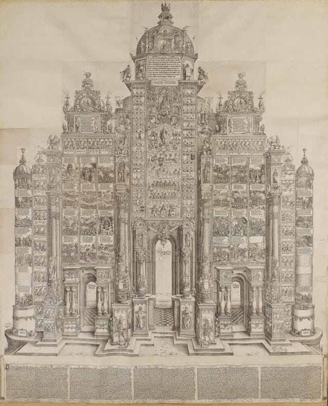 On the British Museum’s site, you can find an interactive image of the print, which was commissioned by the Holy Roman Emperor Maximilian I, and was intended to be pasted up and hand-colored on palace walls. The fine details include scenes from Maximilian’s life, like his 1477 marriage to Mary of Burgundy and his 1486 coronation as King of the Romans, with portals below to “Praise,” “Honor and Might,” and “Nobility.” At the top of the narrative architecture is an allegorical scene with a lion symbolizing power and an eagle indicating wisdom, while Egyptian hieroglyphics and busts of Alexander the Great and Julius Caesar reinforce the visual message of power and his right to rule.