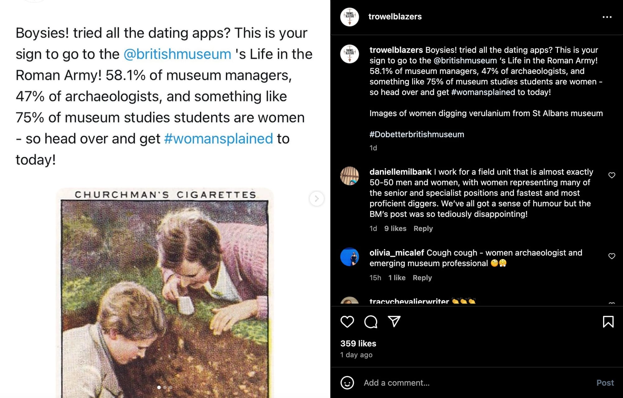 Trowel Blazers, an archaeological group dedicated to highlighting women's experiences and contributions to the field, said the museum's use of the meme was "lazy" and "reinforced a stereotype glass ceiling," also advising men not to mansplain Roman Archaeology to women as "they probably dug it up."