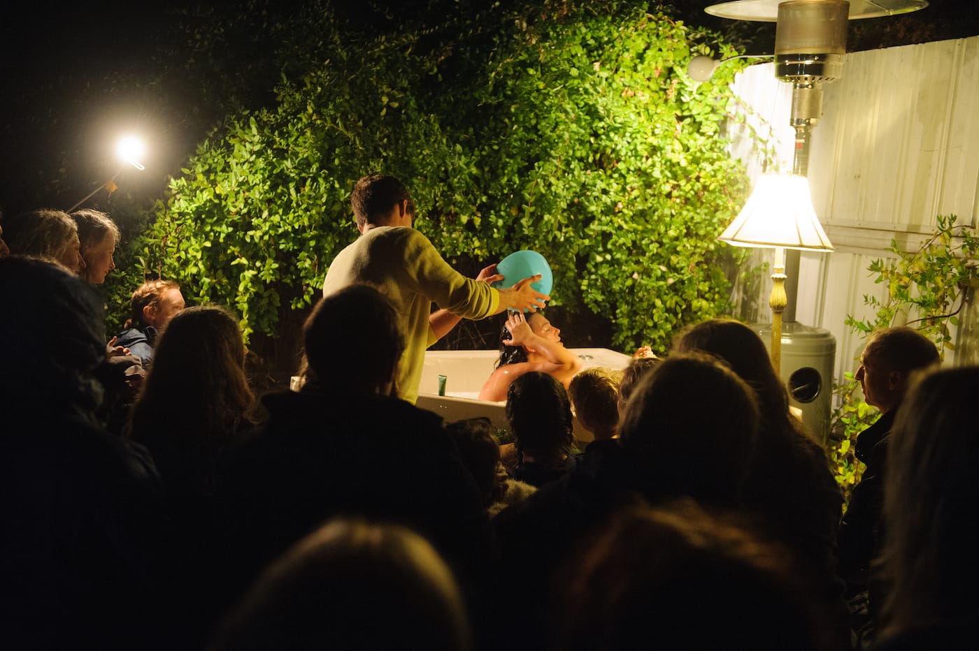 If it sounds voyeuristic, or gimmicky, it’s O’Loughlin’s approachability as a storyteller and a listener that makes Broken Bone Bathtub both compelling theater and a cathartic group experience. As she performs her monologue about a head-on bicycle accident, and the vulnerability and loneliness that followed when she found herself on the wet pavement with a mangled hand, she asks audience members about their own experiences with isolation and injury. She also asks for help, in washing her hair and back, and massaging her hand. Each night of Broken Bone Bathtub, due to its pop-up nature, is site-specific. The evening I attended was in a rather nice studio in a new Brooklyn building, feeling a bit like a chill house party with its friendly resident offering hummus snacks before the show, yet others have been more elaborate. Last fall in Baltimore, in a run produced by Submersive Productions, an installation by artist Amanda Burnham and soundscape by Glenn Ricci led guests up a home’s staircase to the performance space.