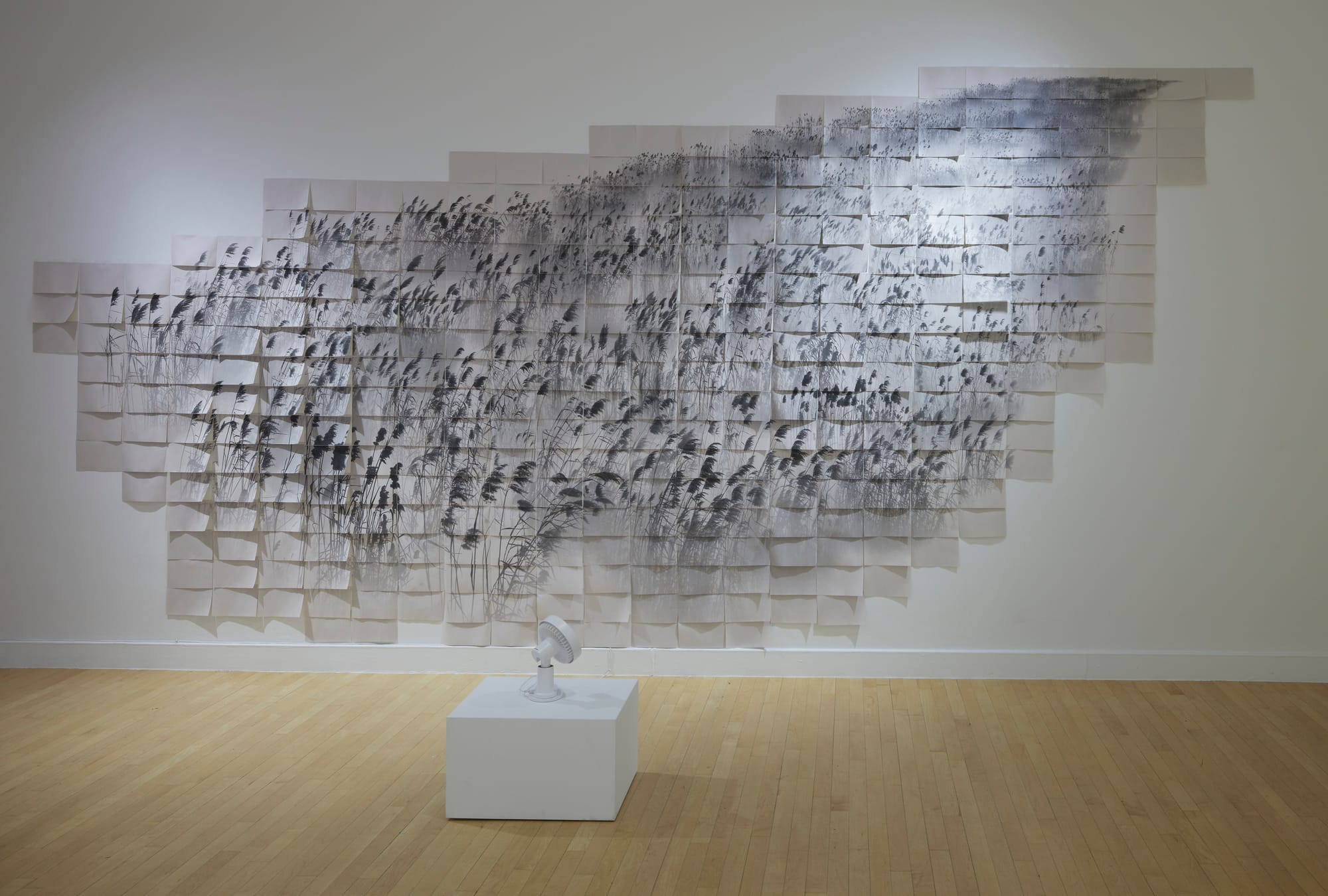 Many of the most ravishing works make use of space in this way, like Camille Hoffman’s “Current (Remembrance) Events” (2021), in which a vinyl blue wave crashes over a corner staircase. In an opposite corner, conceptual artist Nari Kim left jars full of pickled jalapeños — a staple of Korean cuisine. Daqi Fang’s collage “The Marshes” (2020) depicts a large-scale photo of Chinese reeds from the artist's own archives of Wuhan's disappearing wetlands, printed onto small squares of newsprint paper and affixed to the wall. A tiny box fan casts a slight breeze across the delicate composition, producing a somber, artificial sway.