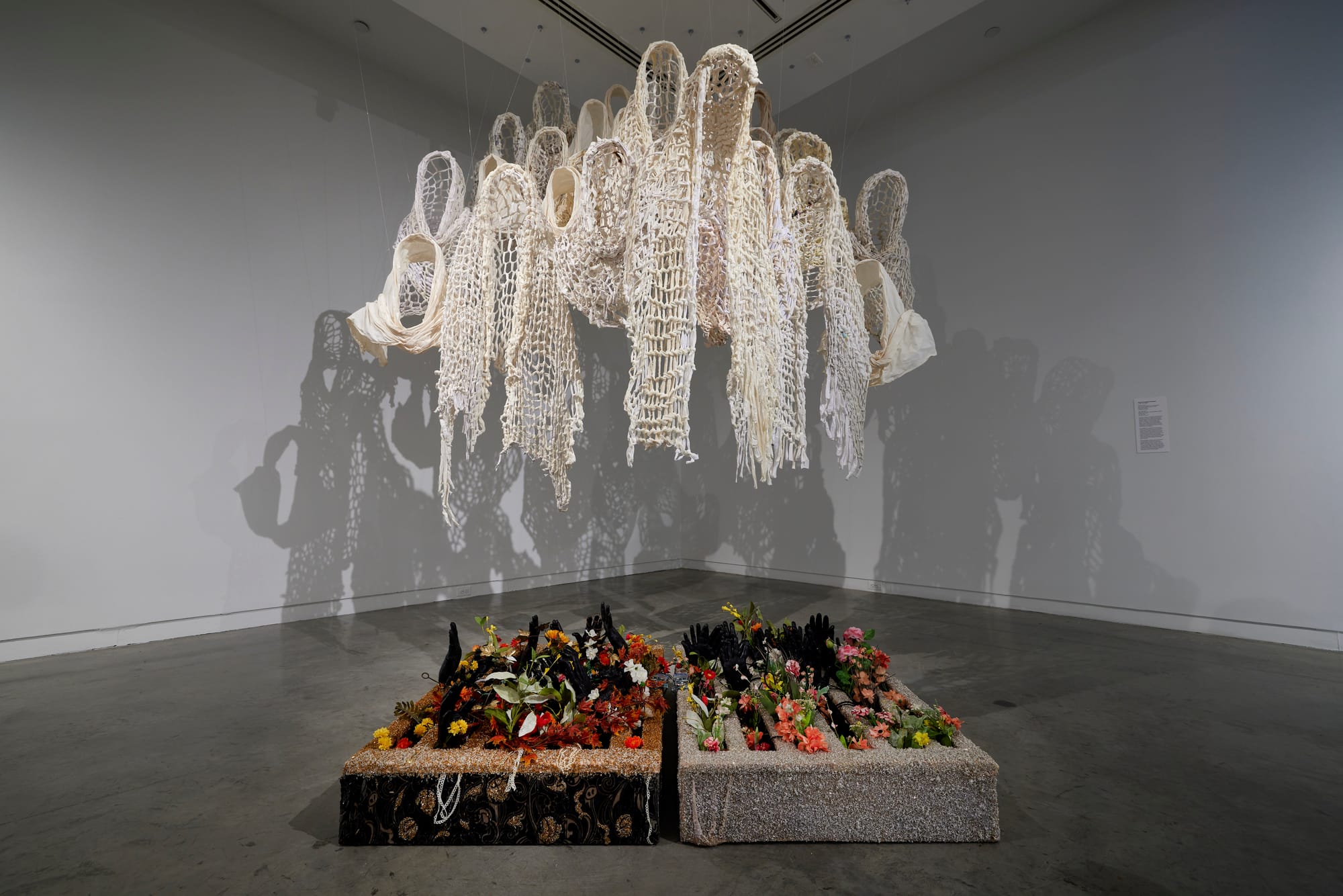As COVID-19 lays bare the shallow social contract in the United States, the art on view addresses the joint crises of public health and capitalist exploitation. A sculptural installation by Nigerian artist Victoria-Idongesit Udondian is composed of a spectral congregation of handwoven hijabs floating above a bed of flowers. The hijabs are suspended at an angle wherein they seem to gaze directly at the viewer, while Black hands reach up through the soil below. Udondian translates neocolonial violence against African women into a haunting image of resurrection. It’s an absolutely breathtaking piece, and worth the trip on its own.